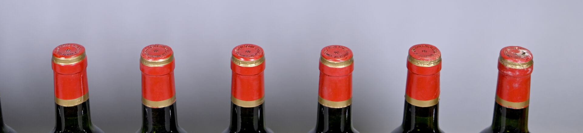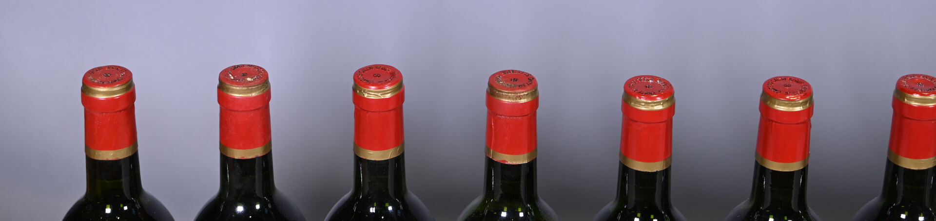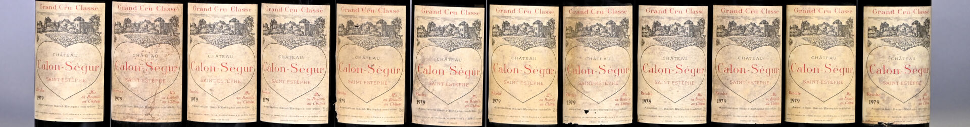 BORDEAUX – 1 CBO, 12 bouteilles, Saint-Estèphe, Château Calon-Ségur, 3ème Grand Cru Classé, 1979. 1 BG (-), 1 TLB (+), 5 TLB, 1 TLB (-), 1 HE (+) et 1 ME. Capsules avec des traces à légèrement sales dont une présente une déchirure en son sommet. Etiquettes légèrement sales à sales avec quelques points de décollement et dont quatre sont légèrement abimées.