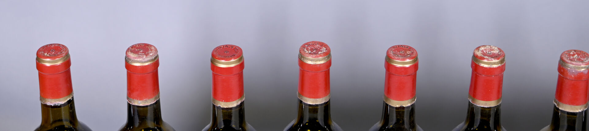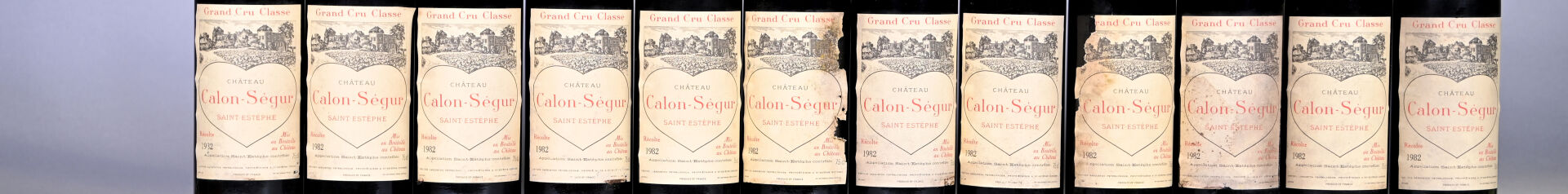 BORDEAUX – 1 CBO, 12 bouteilles, Saint-Estèphe, Château Calon-Ségur, 3ème Grand Cru Classé, 1982. 3 TLB (-), 2 HE (+), 3 HE, 2 HE (-), 1 ME (+) et 1 ME. Capsules légèrement sales à sales et abimées en bas de jupe. Etiquettes légèrement sales avec des points de décollement et dont trois sont légèrement abimées à abimées.