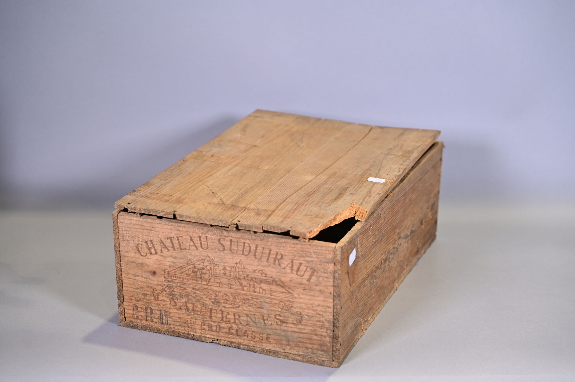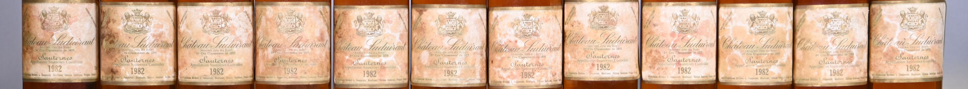 BORDEAUX – 1 CBO, 12 bouteilles, Sauternes, Château Suduiraut, 1er Grand Cru Classé, 1982. 1 BG (+), 1 BG, 4 BG (-) et 6 TLB (+). Capsules légèrement sales. Etiquettes sales dont une présente un point de décollement dans son angle droit inférieur et deux autres sont partiellement décollées.