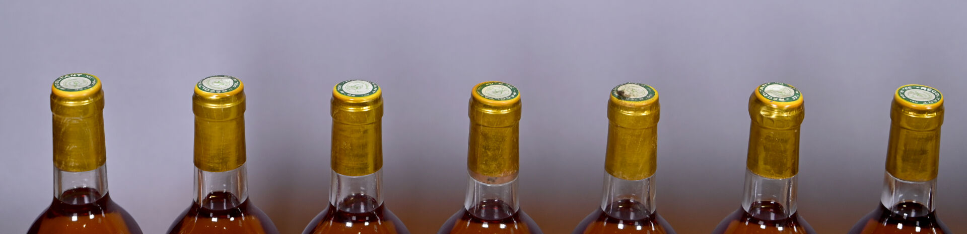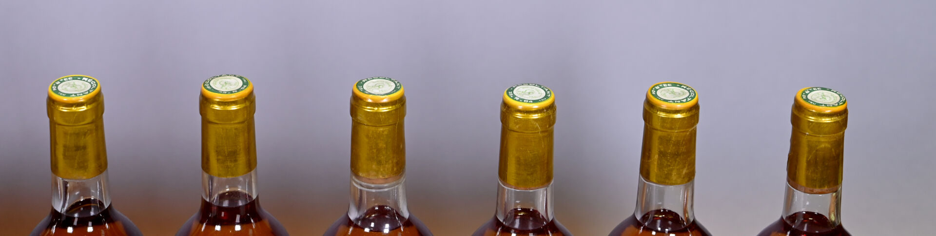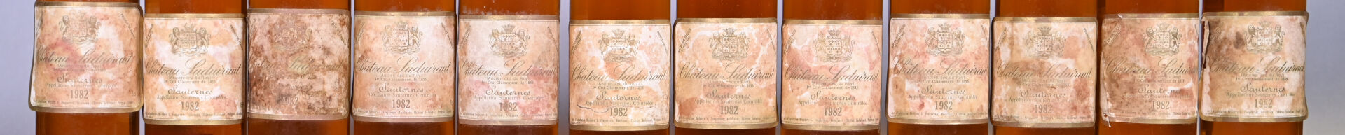 BORDEAUX – 1 CBO, 12 bouteilles, Sauternes, Château Suduiraut, 1er Grand Cru Classé, 1982. Traces de coulure ancienne sur une bouteille. 1 BG (+), 3 BG, 7 BG (-) et 1 TLB (+). Capsules légèrement sales. Etiquettes sales à très sales avec des points de décollement à partiellement décollées dont une est entièrement décollée. Trois étiquettes sont légèrement abimées à abimées.