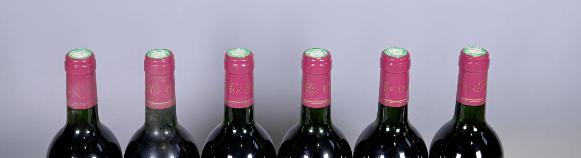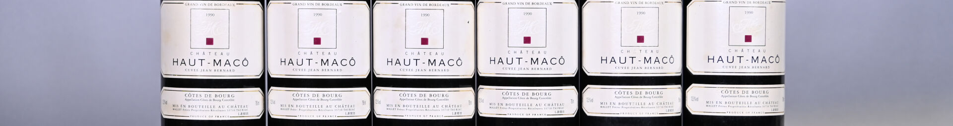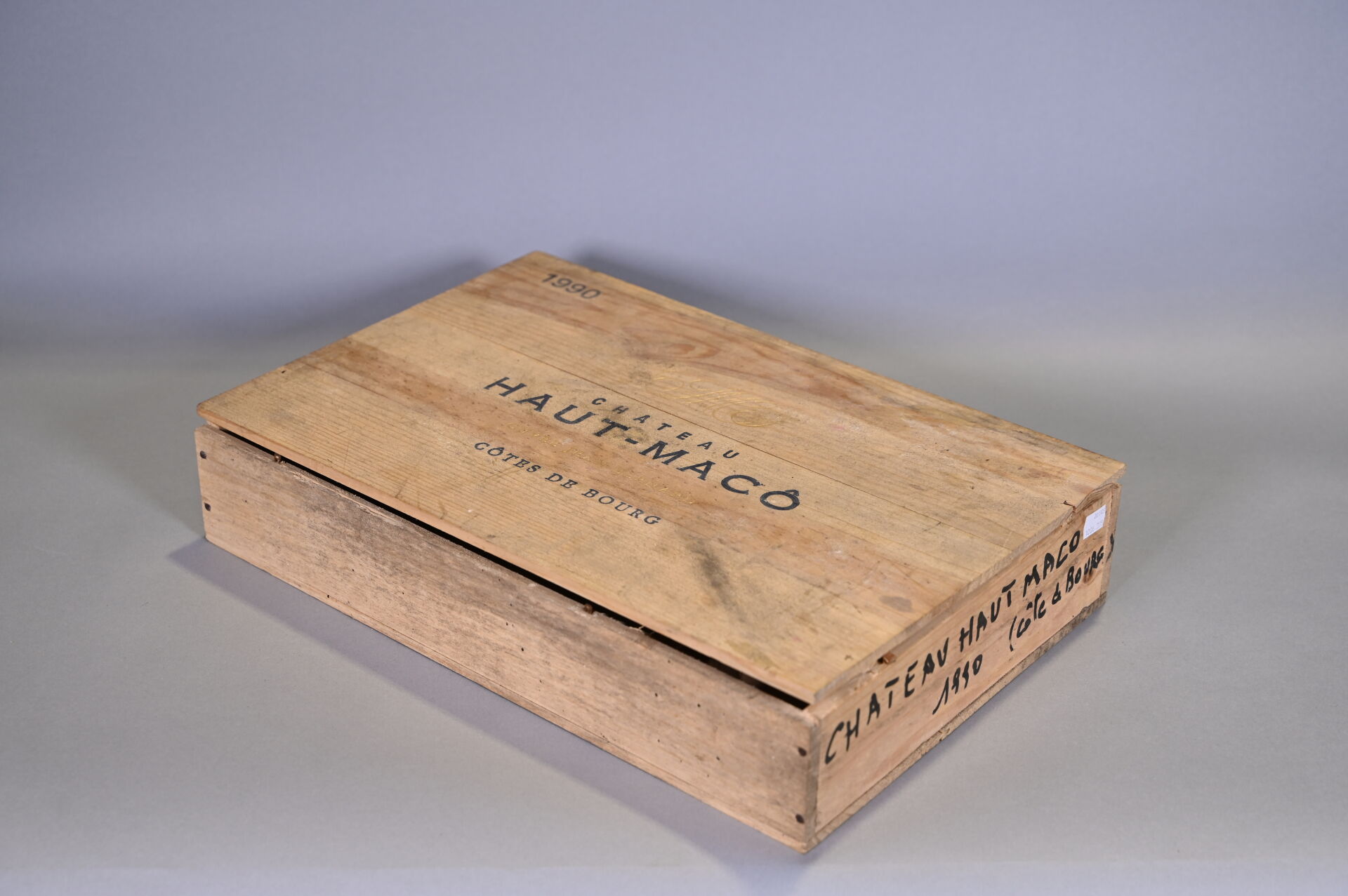BORDEAUX – 1 CBO, 6 bouteilles, Côtes de Bourg, Château Haut-Macô, 1990. 1 BG (-), 1 TLB (+) et 4 TLB. Capsules et étiquettes très légèrement sales.