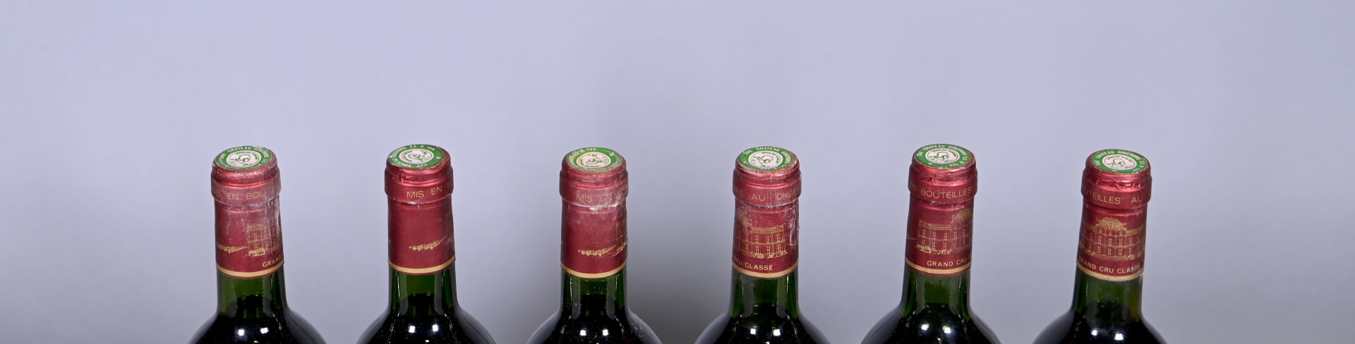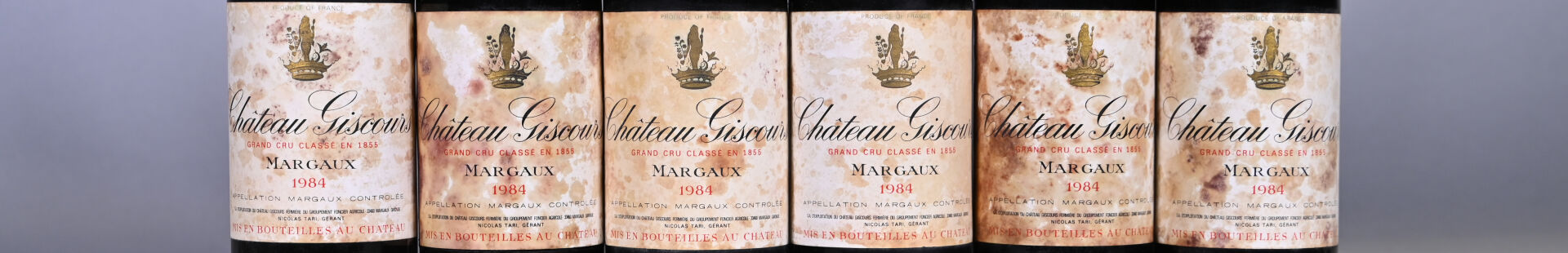 BORDEAUX – 1 CBO, 6 bouteilles, Margaux, Château Giscours, 3ème Grand Cru Classé, 1984. 2 BG (+), 2 BG et 2 BG (-). Capsules légèrement sales. Etiquettes sales et tachées dont deux sont partiellement décollées et quatre entièrement décollées.