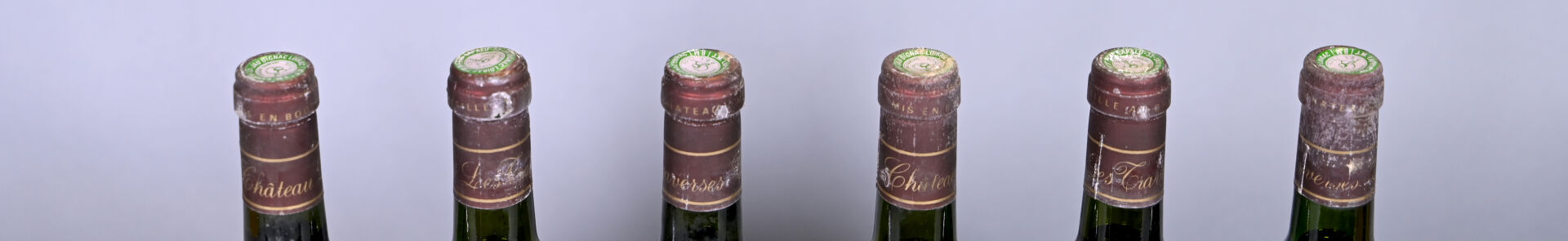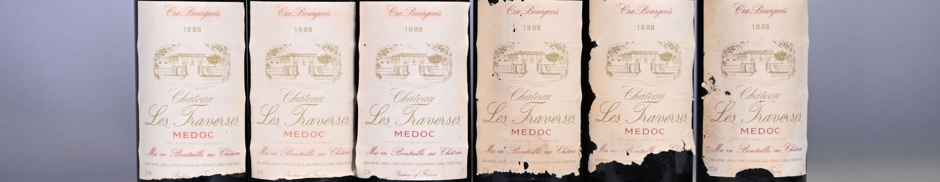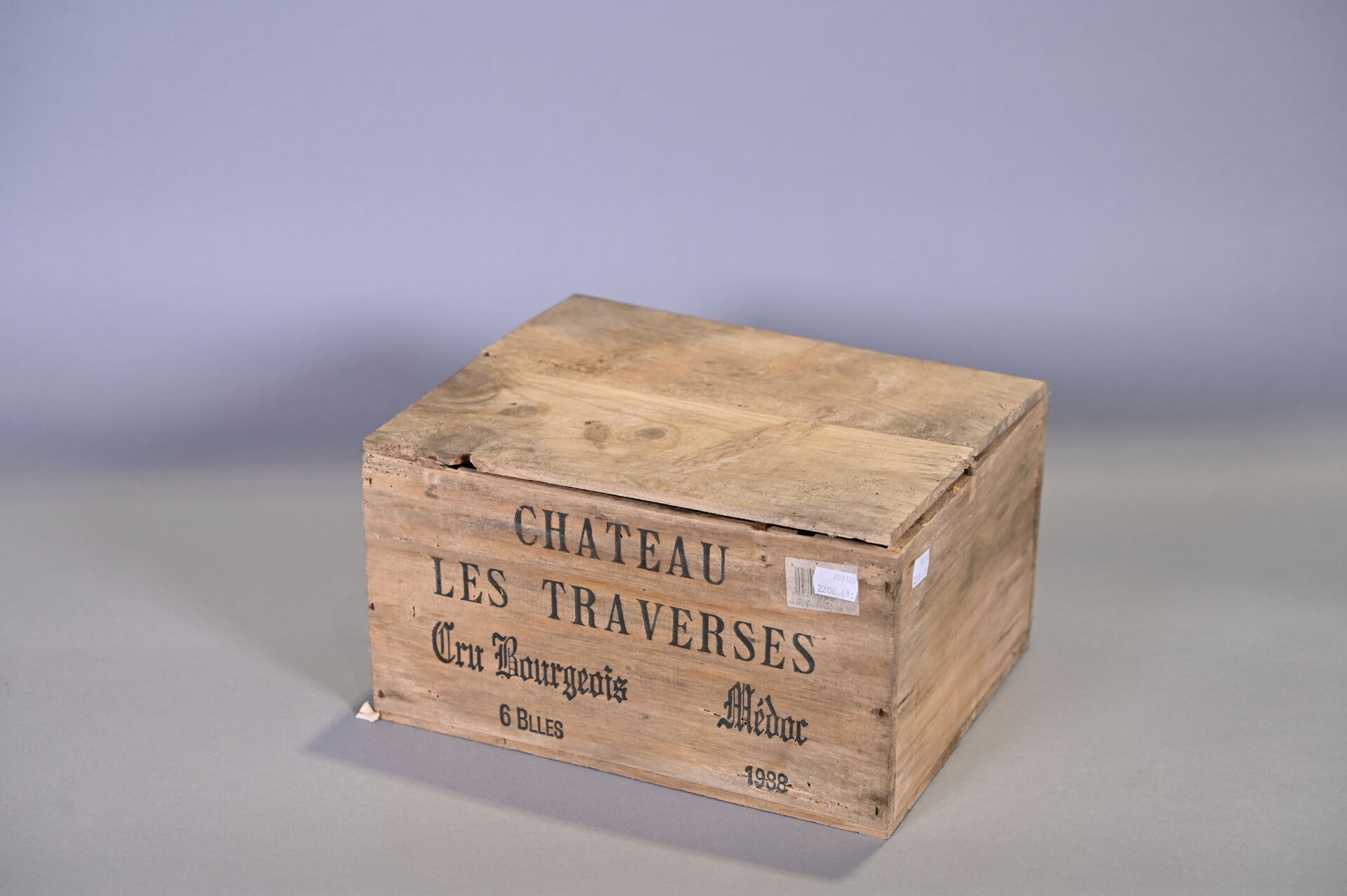 BORDEAUX – 1 CBO, 6 bouteilles, Médoc, Château Les Traverses, Cru Bourgeois, 1988. 1 BG (+), 1 TLB (+) et 1 TLB (-). Capsules sales et déformées en leur sommet. Etiquettes sales avec des points de décollement et légèrement abimées à abimées.