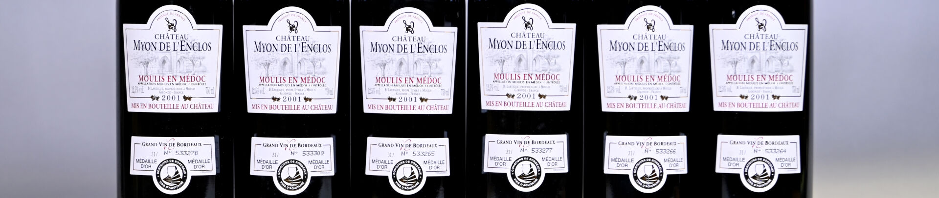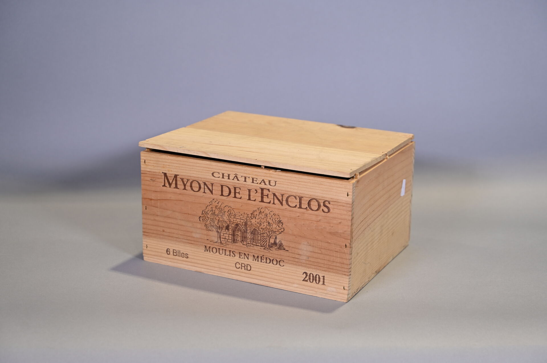 BORDEAUX – 1 CBO, 6 bouteilles, Moulis, Château Myon de l’Enclos, 2001. 4 BG (+) et 2 BG.