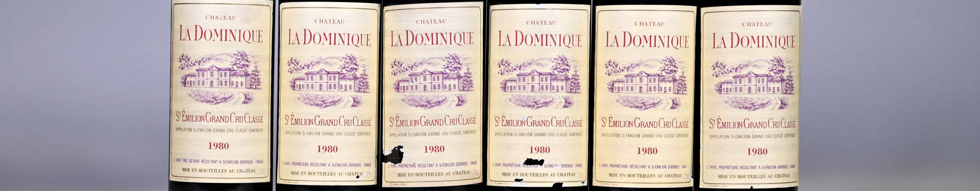 BORDEAUX – 1 CBO, 6 bouteilles, Saint-Emilion Grand Cru, Château La Dominique, Grand Cru Classé, 1980. 1 TLB et 2 TLB (-). Capsules avec de légères traces. Etiquettes légèrement fanées et très légèrement abimées à légèrement abimées.