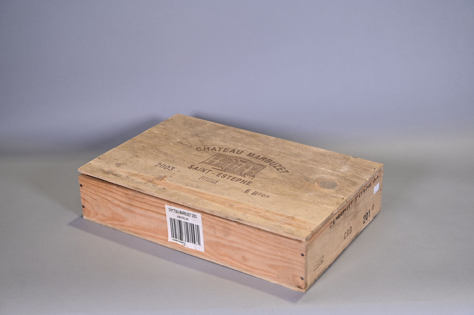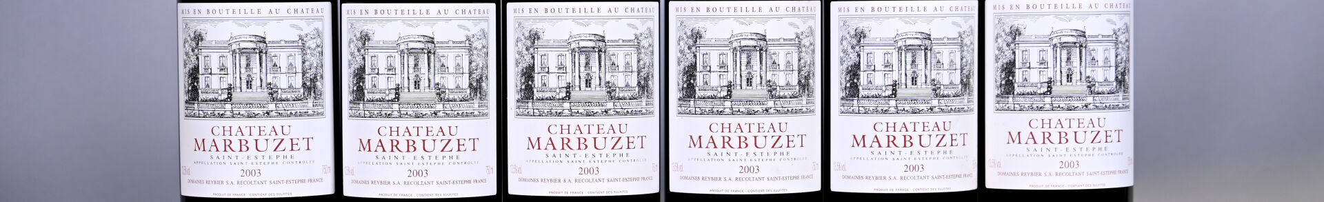 BORDEAUX – 1 CBO, 6 bouteilles, Saint-Estèphe, Château Marbuzet, 2003. 1 BG. Capsules légèrement bombées.
