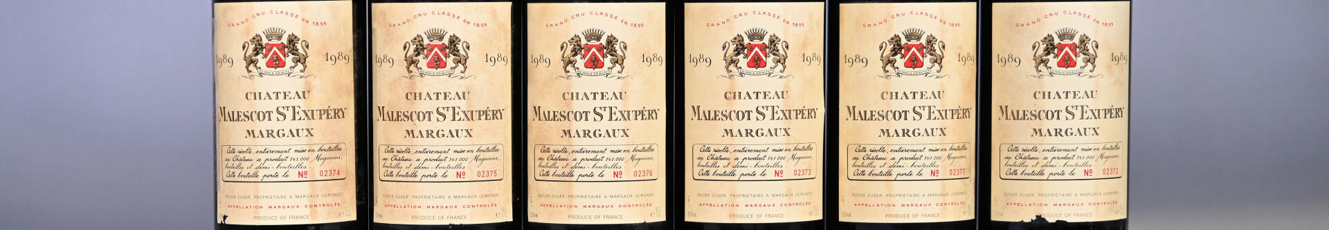 BORDEAUX – 1 CBO, 6 magnums, Margaux, Château Malescot-Saint-Exupéry, 3ème Grand Cru Classé, 1989. Capsules légèrement sales avec quelques traces de frottement. Etiquettes légèrement sales avec des points de décollement dont deux sont entièrement décollées et deux légèrement abimées.