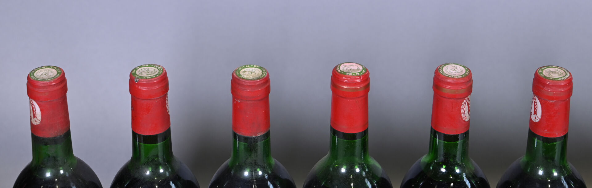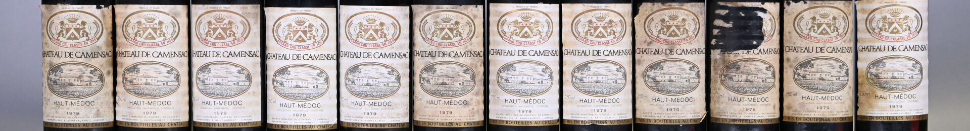 BORDEAUX – 12 bouteilles, Haut-Médoc, Château Camensac, 5ème Grand Cru Classé, 1979. 2 TLB (+), 4 TLB, 3 TLB (-), 1 HE (+), 1 HE et 1 HE (-). Etiquettes légèrement sales à sales avec des points de décollement dont six sont légèrement abimées et une présente une importante déchirure.