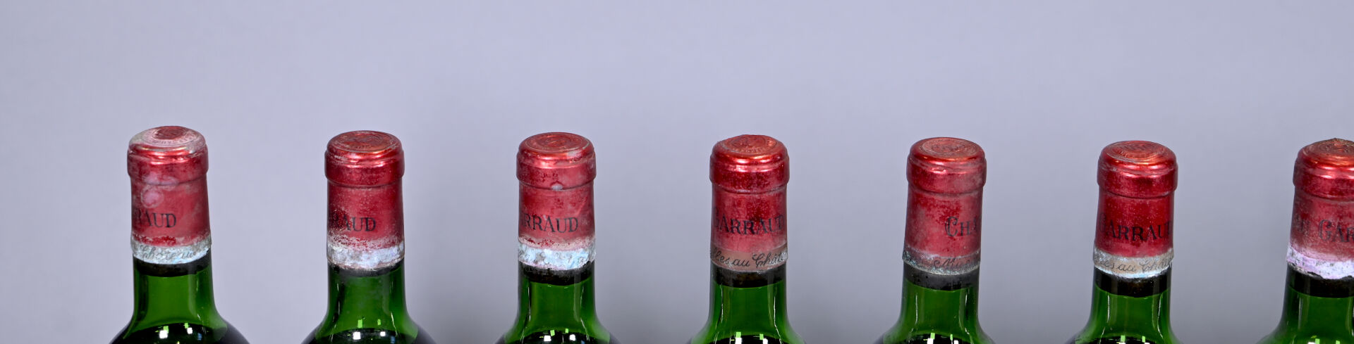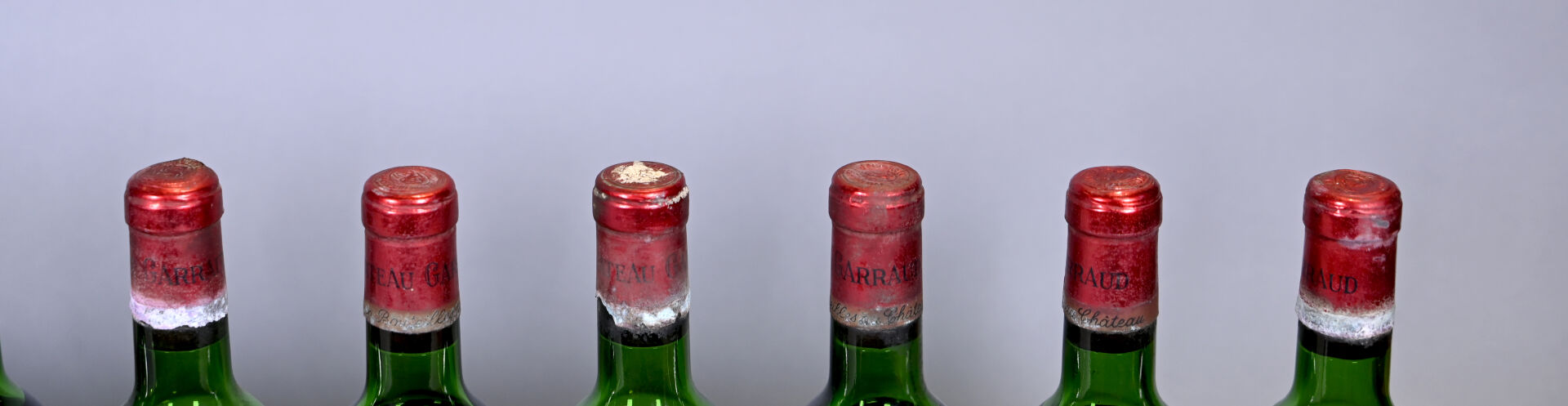 BORDEAUX -12 bouteilles, Lalande-de-Pomerol, Château Garraud, 1970. 1 HE (+), 5 HE, 4 HE (-), 1 ME et 1 ME (-). Capsules sales avec des traces d’oxydation en bas de jupe. Etiquettes sales dont deux sont abimées à très abimées.