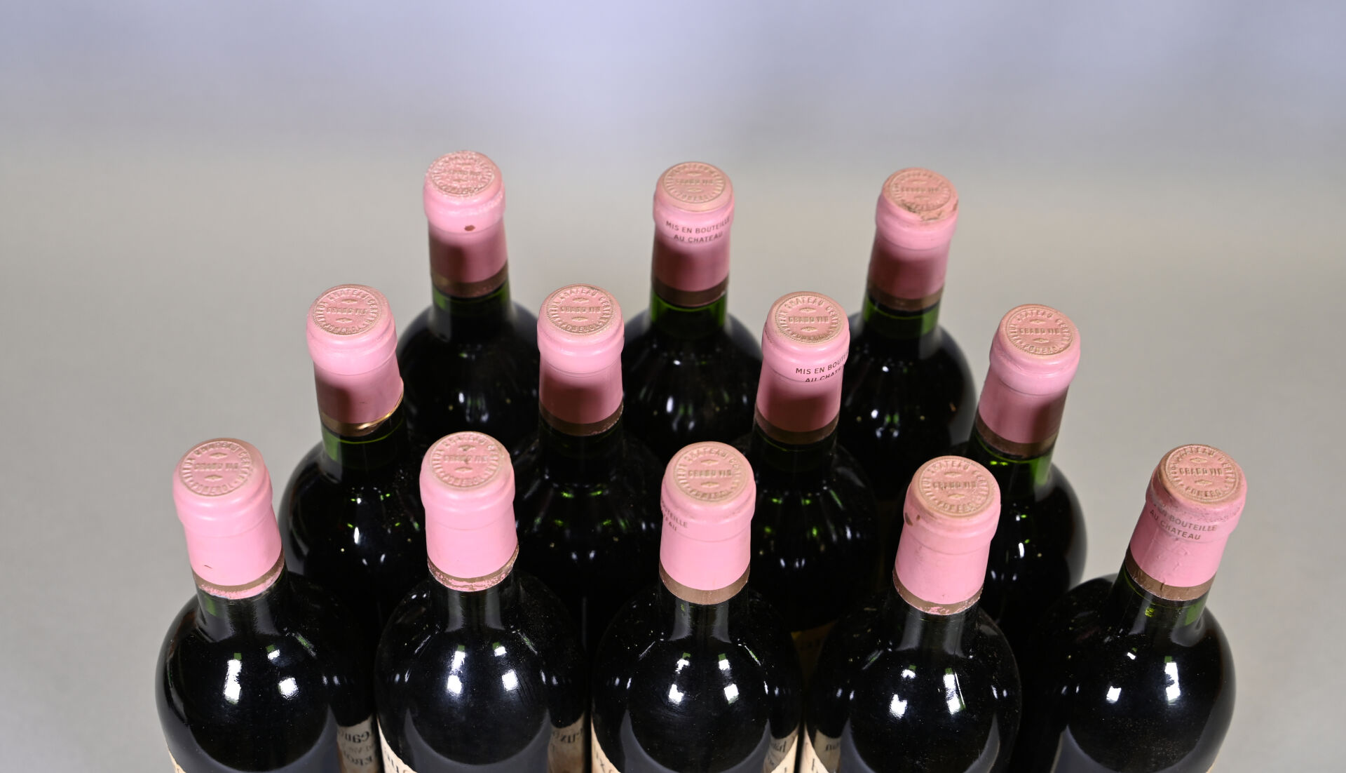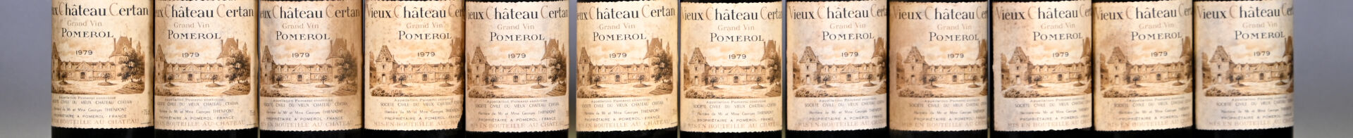 BORDEAUX – 12 bouteilles, Pomerol, Vieux Château Certan, 1979. 1 BG. Capsules légèrement sales dont trois sont légèrement abimées en bas de jupe. Etiquettes légèrement sales à sales avec des traces d’humidité et dont une est déchirée sur son côté droit.