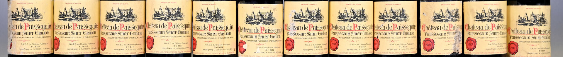 BORDEAUX – 12 bouteilles, Puisseguin Saint-Emilion, Château Puisseguin, 1983. 1 BG (+), 2 BG, 2 BG (-), 1 TLB (+), 3 TLB et 1 TLB (-). Capsules avec des traces et très légèrement abimées en bas de jupe. Etiquettes légèrement sales et légèrement abimées à abimées.
