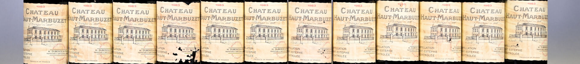 BORDEAUX – 12 bouteilles, Saint-Estèphe, Château Haut-Marbuzet, 1983. 3 BG, 1 BG (-), 4 TLB, 3 HE (+) et 1 ME (+). Huit capsules incurvées dont une est légèrement sale en son sommet et une autre présente un pli en bas de jupe. Trois capsules sont déformées en leur sommet. Etiquettes légèrement sales à sales donc cinq sont abimées.