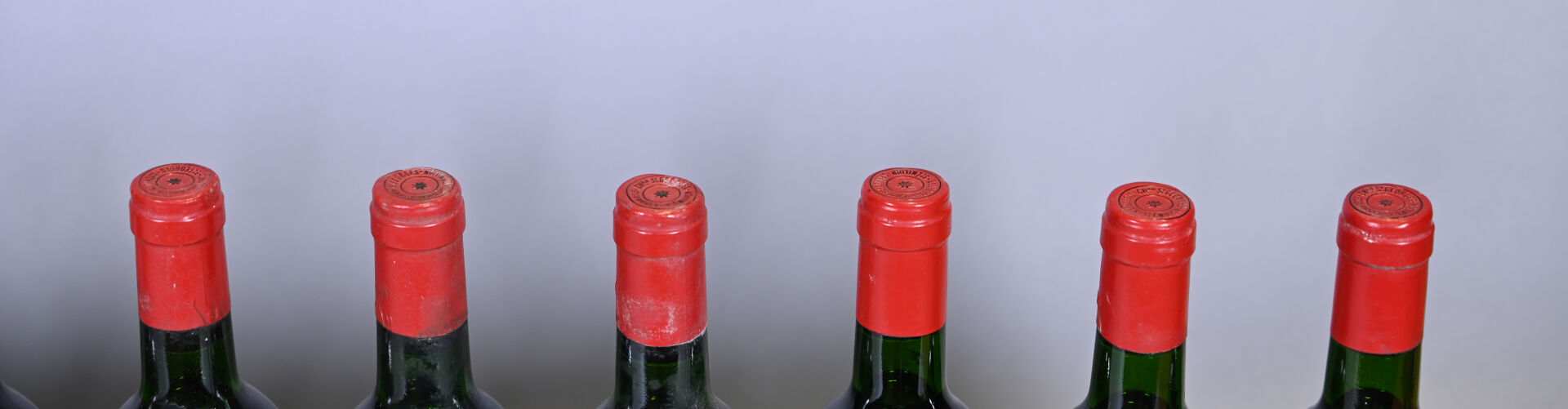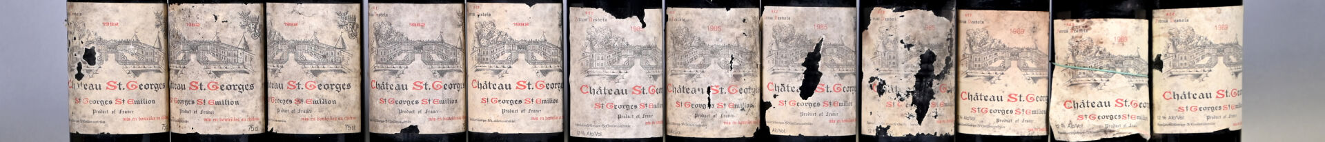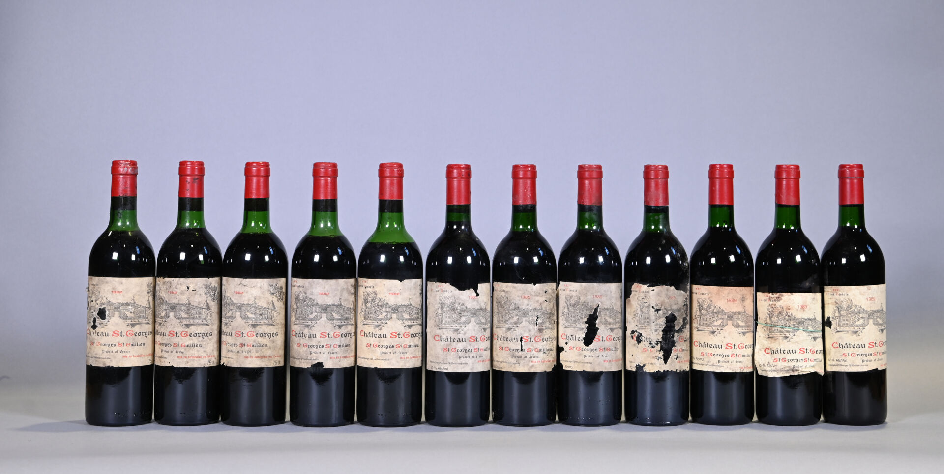 BORDEAUX – 12 bouteilles, Saint-Georges Saint-Emilion, Château Saint-Georges, 1982 (5), 1985 (4) et 1989 (3). 1 BG (+), 4 BG (-), 3 TLB, 1 HE (+), 1 HE et 1 ME. Capsules légèrement sales. Etiquettes sales à très sales avec des traces d’humidité, abimées à très abimées avec des points de décollement et dont une est entièrement décollée.