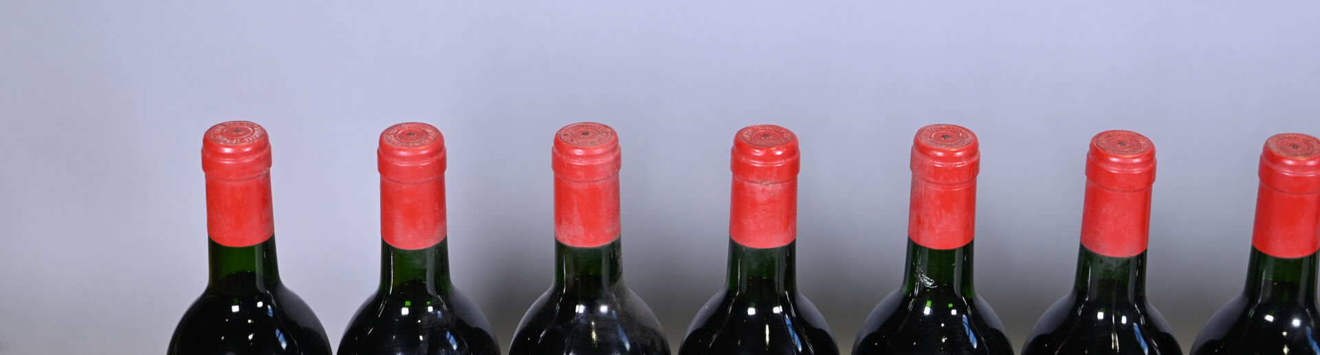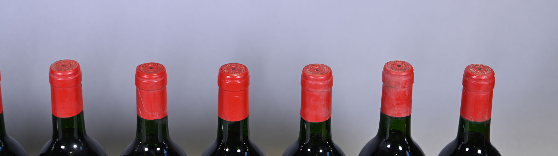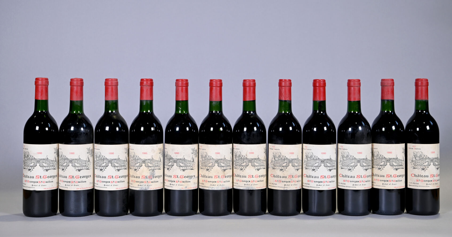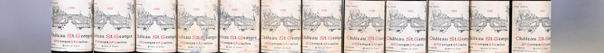 BORDEAUX – 12 bouteilles, Saint-Georges Saint-Emilion, Château Saint-Georges, 1990. 4 BG (+), 1 BG, 1 BG (-) et 2 TLB (+). Capsules légèrement sales. Etiquettes légèrement sales dont six sont légèrement abimées.