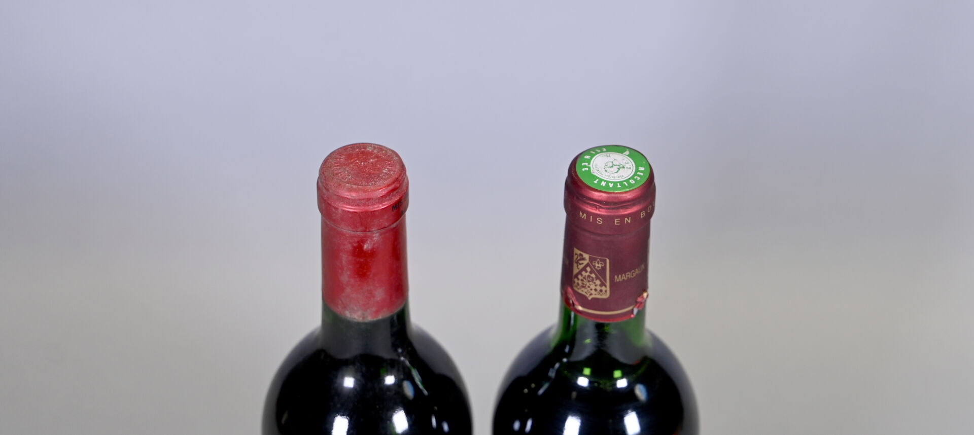 BORDEAUX – 2 bouteilles, Margaux, Château Palmer, 3ème Grand Cru Classé, 1982 (1) et 1988 (1). 1 TLB (-) (1982). Capsules légèrement sales à sales dont une est abimée. Etiquettes sales dont une est abimée