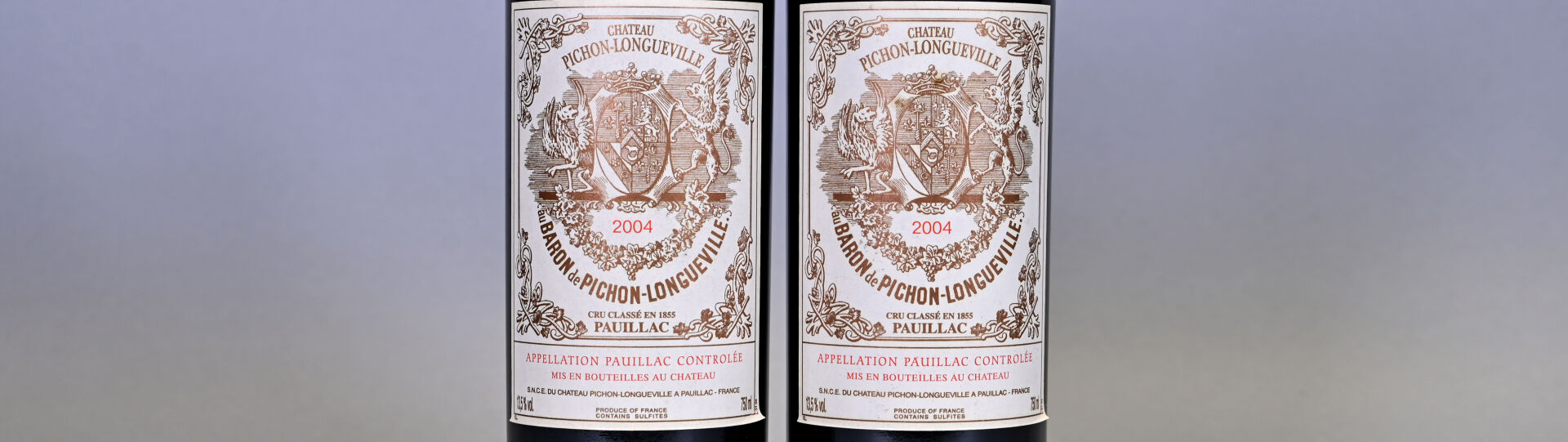 BORDEAUX – 2 bouteilles, Pauillac, Château Pichon-Longueville Baron, 2ème Grand Cru Classé, 2004. Etiquettes avec un petit point de décollement au niveau de leur angle inférieur droit.