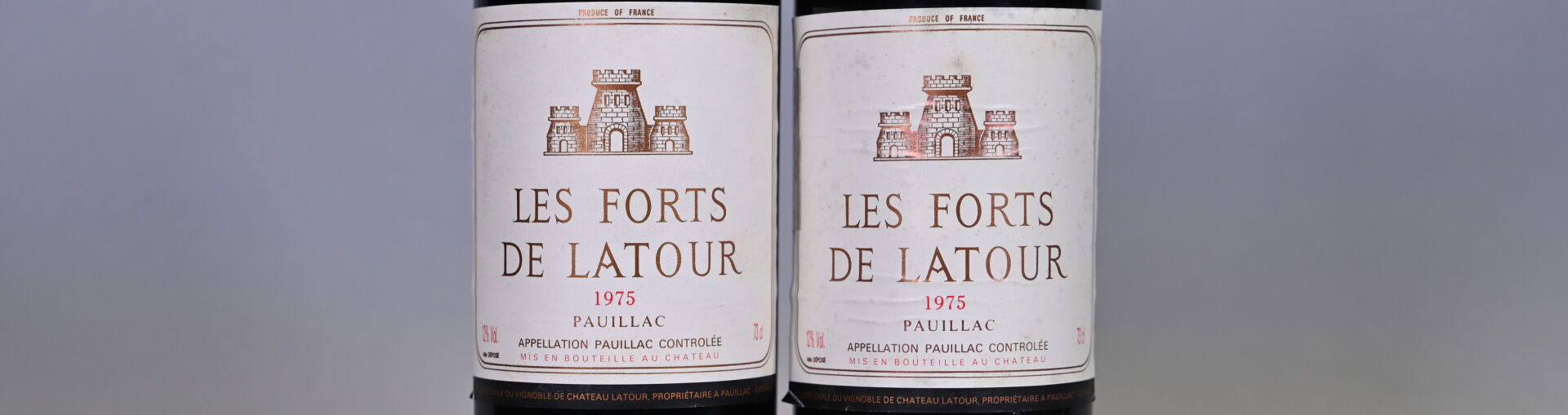 BORDEAUX – 2 bouteilles, Pauillac, Les Forts de Latour (second vin du Château Latour), 1975. 1 TLB (+) et 1 HE (+). Capsules incurvées. Une étiquette partiellement décollée.