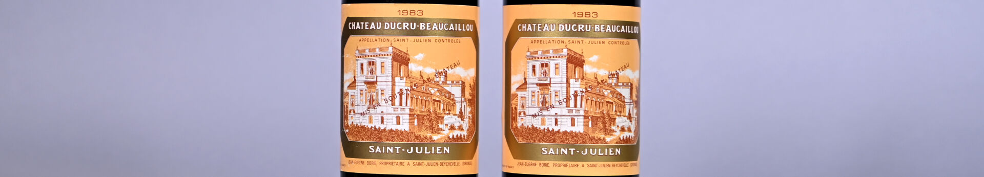 BORDEAUX – 2 bouteilles, Saint-Julien, Château Ducru-Beaucaillou, 2ème Grand Cru Classé, 1983. 1 BG (+) et 1 BG. Une capsule légèrement sale. Une étiquette avec quelques traces de frottement.