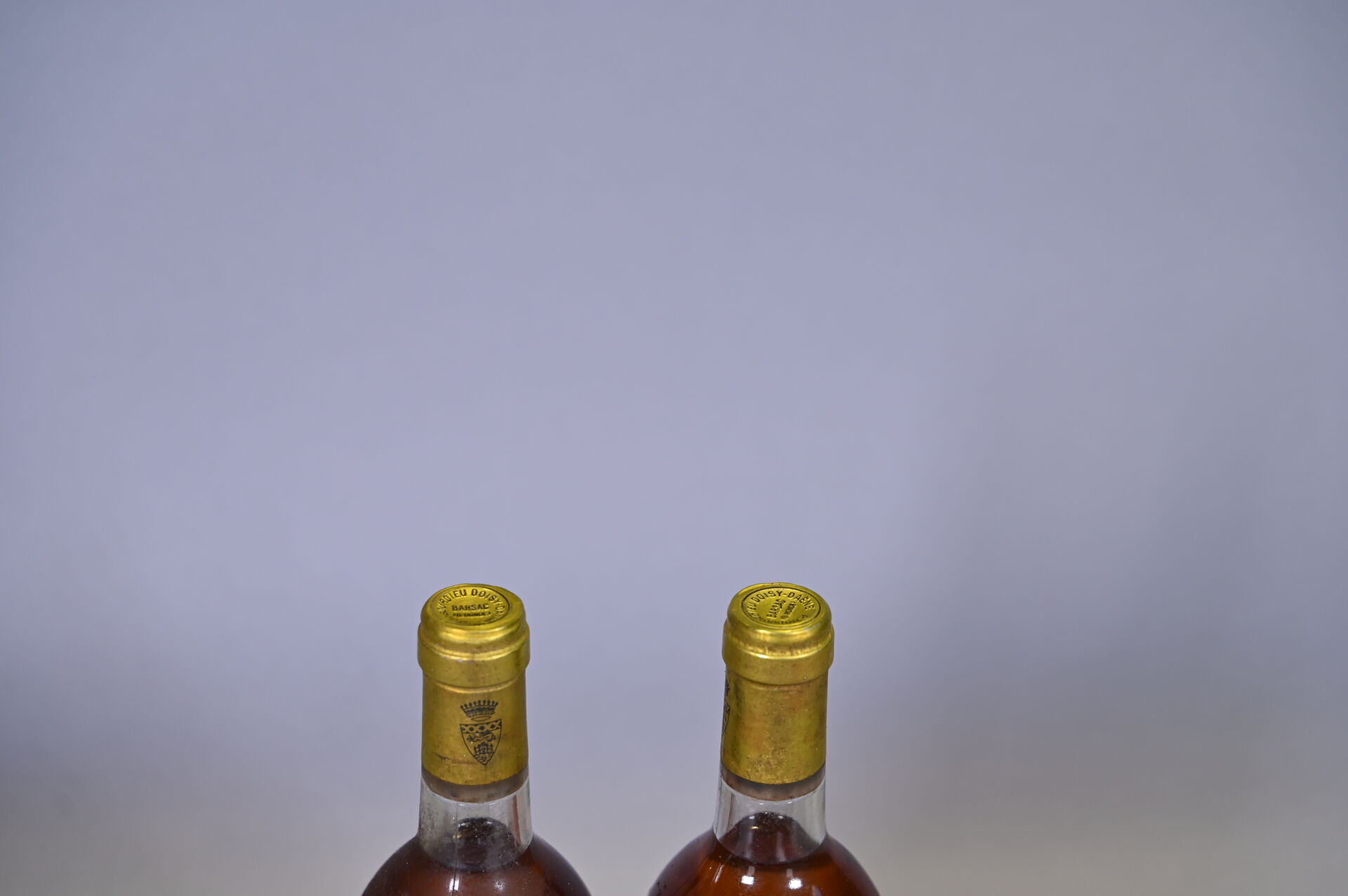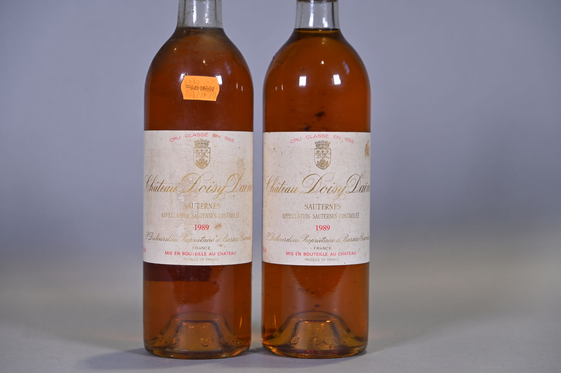 BORDEAUX – 2 bouteilles, Sauternes, Château Doisy Daëne, 2ème Grand Cru Classé, 1989. 2 BG. Capsules incurvées et légèrement sales à sales. Etiquettes légèrement sales à sales.