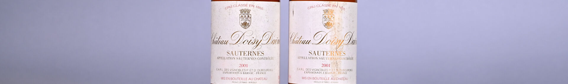 BORDEAUX – 2 bouteilles, Sauternes, Château Doisy Daëne, 2ème Grand Cru Classé, 2001. 2 BG (-). Capsules légèrement sales. Etiquettes légèrement sales à sales dont une est légèrement abimée.