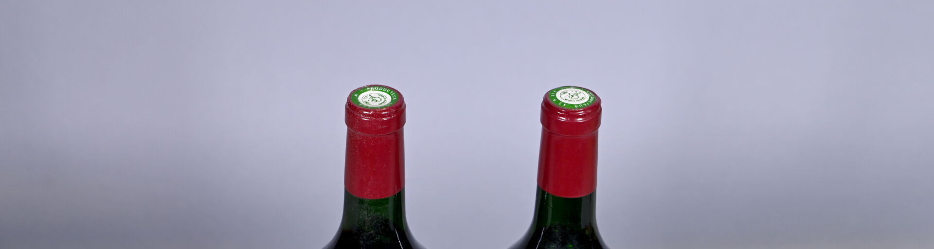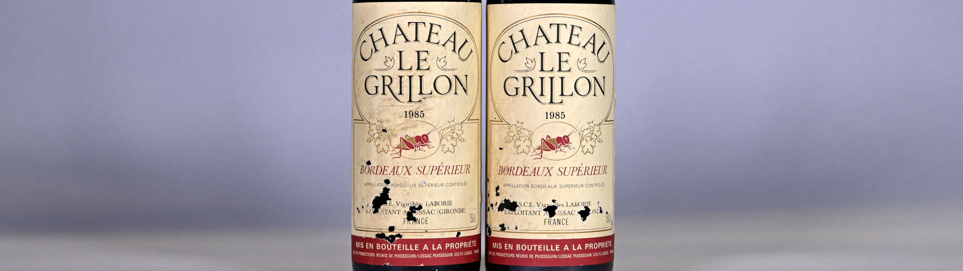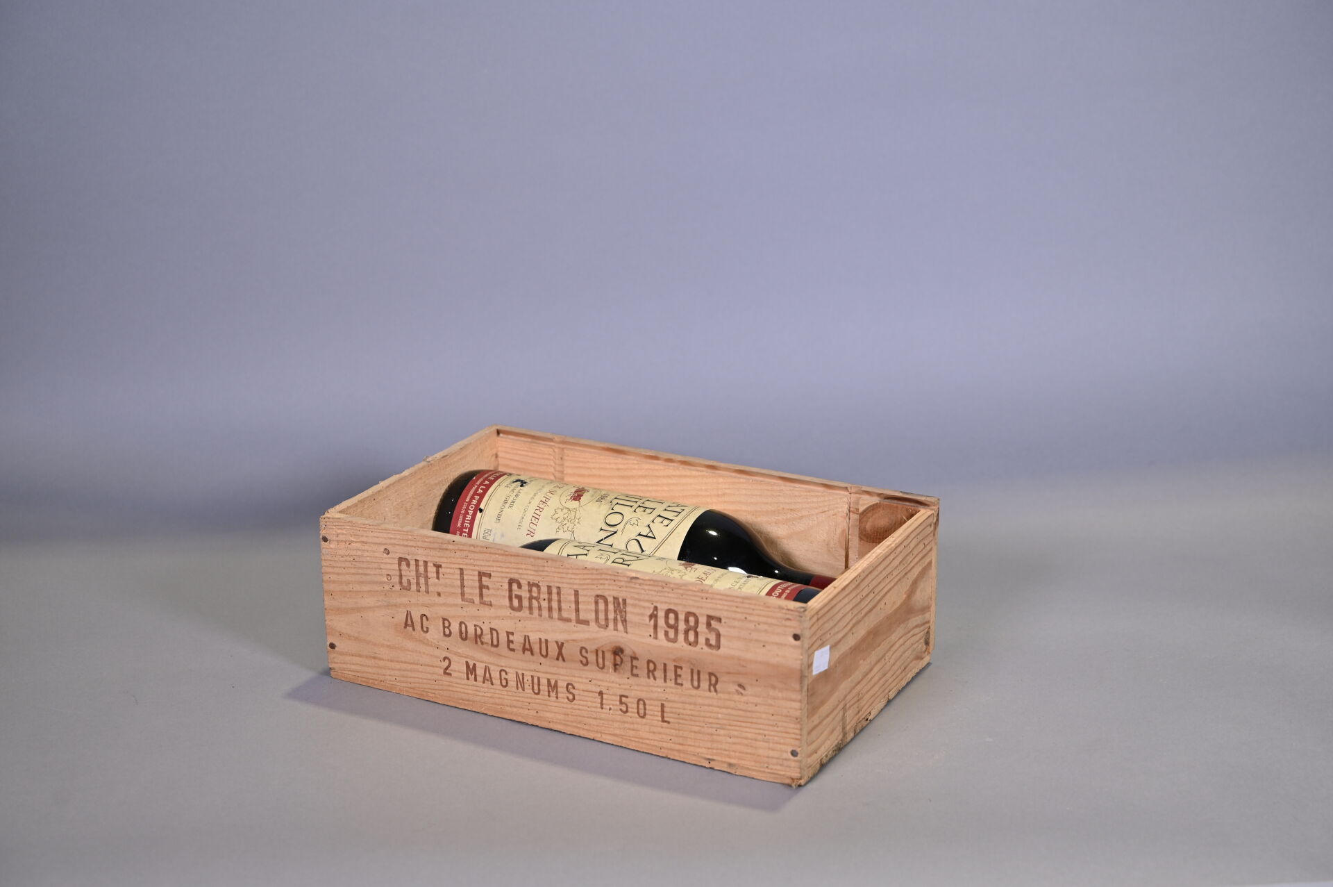 BORDEAUX – 2 magnums, Bordeaux supérieur, Château Le Grillon, 1985. Une capsule légèrement incurvée. Etiquettes légèrement sales à sales et abimées.