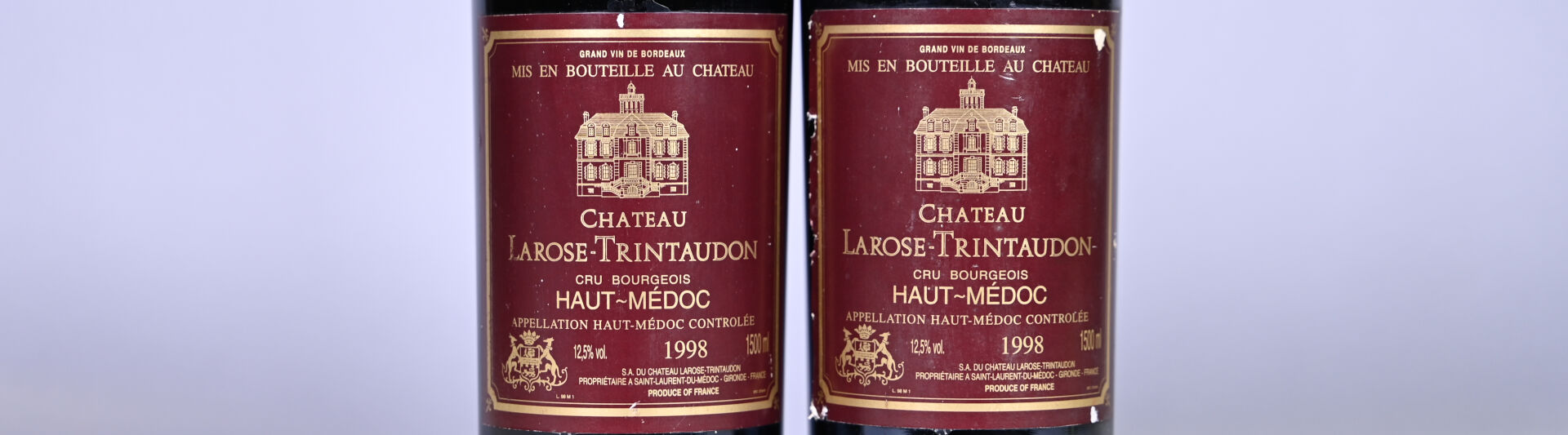 BORDEAUX – 2 magnums, Haut-Médoc, Château Larose Trintaudon, Cru Bourgeois, 1998. Niveaux légèrement bas. Etiquettes légèrement sales et incurvées. Etiquettes avec des traces dont une est très légèrement abimée.