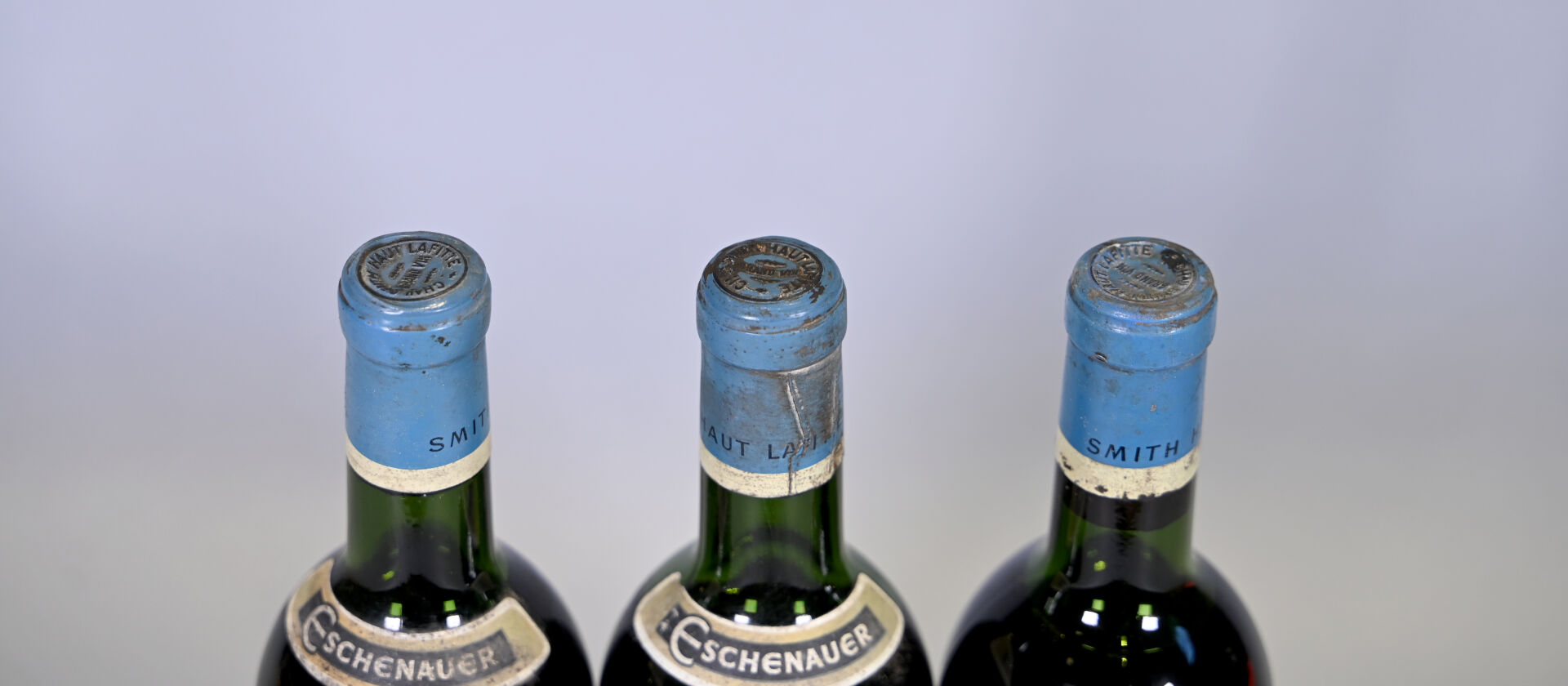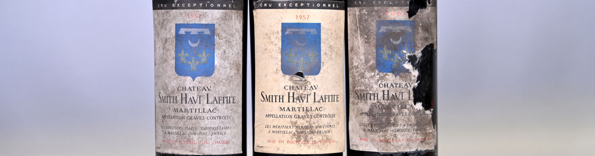 BORDEAUX – 3 bouteilles, Graves, Château Smith Haut Lafitte, Grand Cru Classé, Eschenauer 1957 (2) et 1961 (1). 1 TLB (1957), 1 HE (+) (1961) et 1 ME (+) (1957). Capsules sales et incurvées. Etiquettes sales à très sales avec des points de décollement. Une étiquette est légèrement abimée et une autre dégradée.