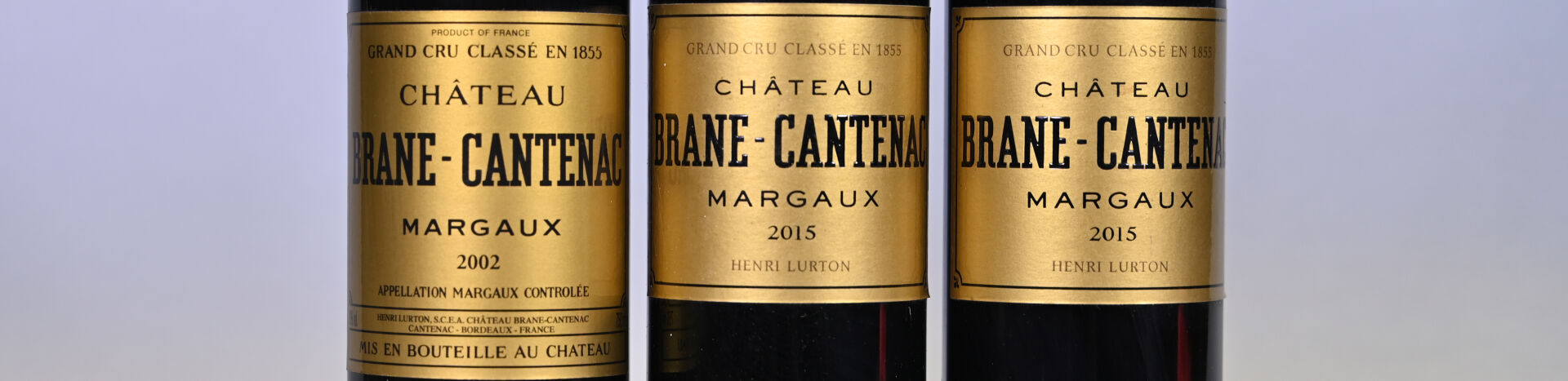 BORDEAUX – 3 bouteilles, Margaux, Château Brane Cantenac, 2ème Grand Cru Classé, 2002 (1) et 2015 (2). Capsules, étiquettes et contre-étiquettes avec quelques légères traces.