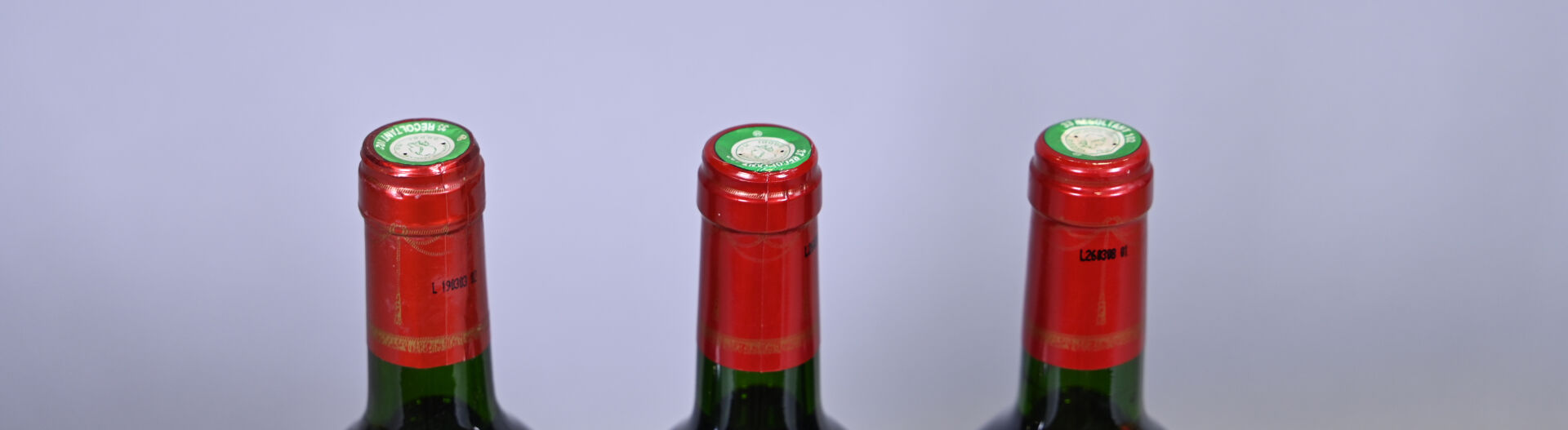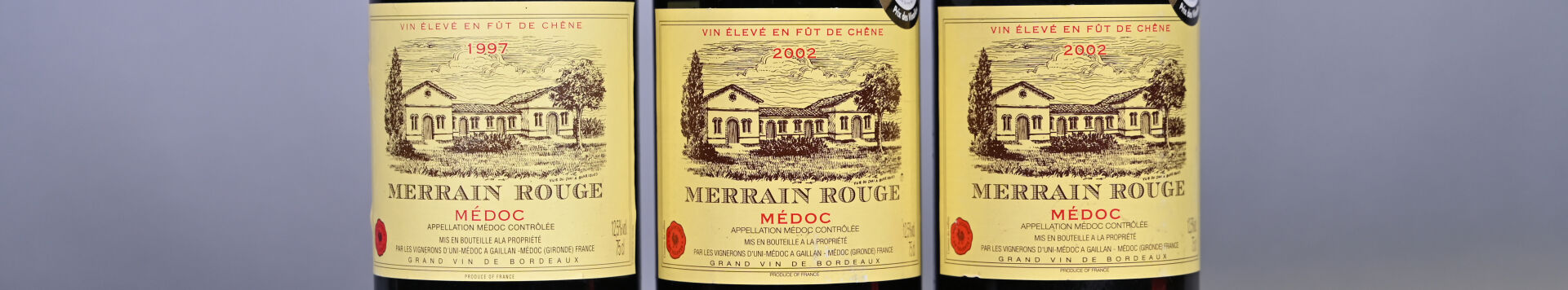 BORDEAUX – 3 bouteilles, Médoc, Merrain Rouge, 1997 (1) et 2002 (2). 1 BG (+), 1 BG et 1 BG (-). Deux capsules incurvées.