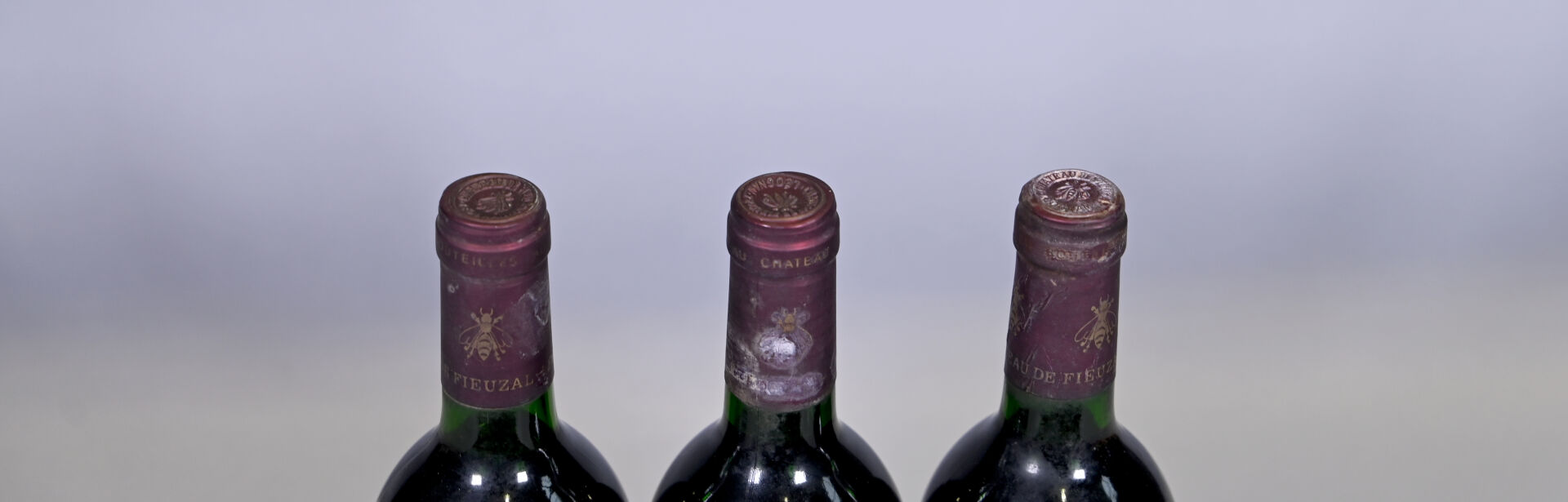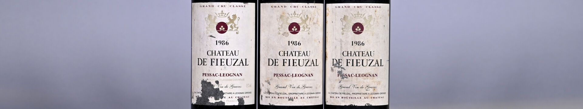 BORDEAUX – 3 bouteilles, Pessac-Léognan, Château de Fieuzal, Grand Cru Classé, 1986. Trois bouchons très légèrement engagés. 1 BG (+) et 2 BG. Capsules très légèrement incurvées à incurvées. Etiquettes sales et abimées.