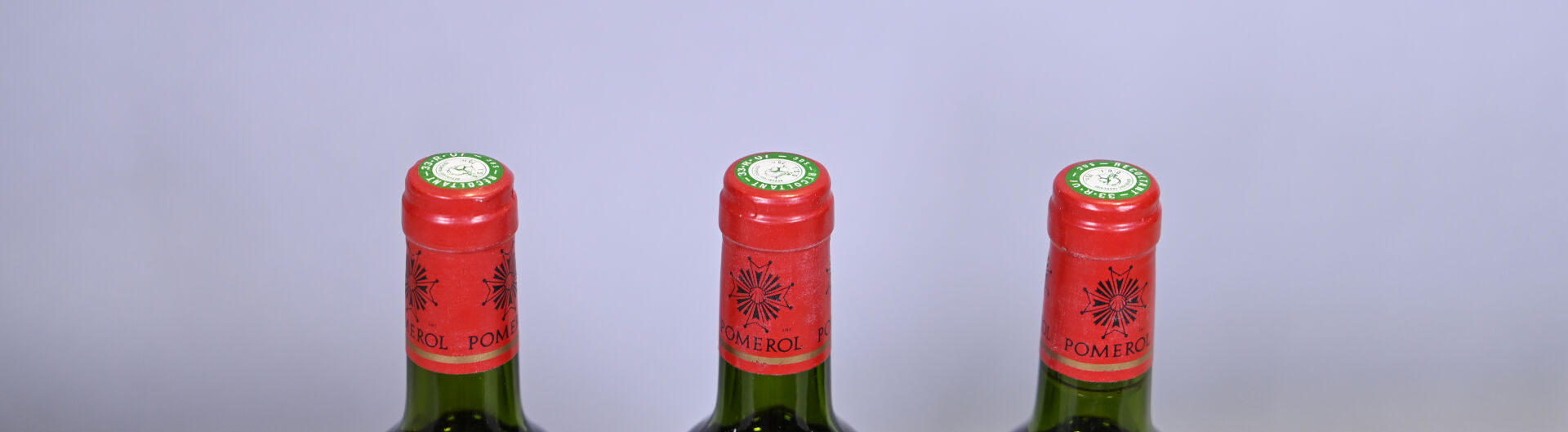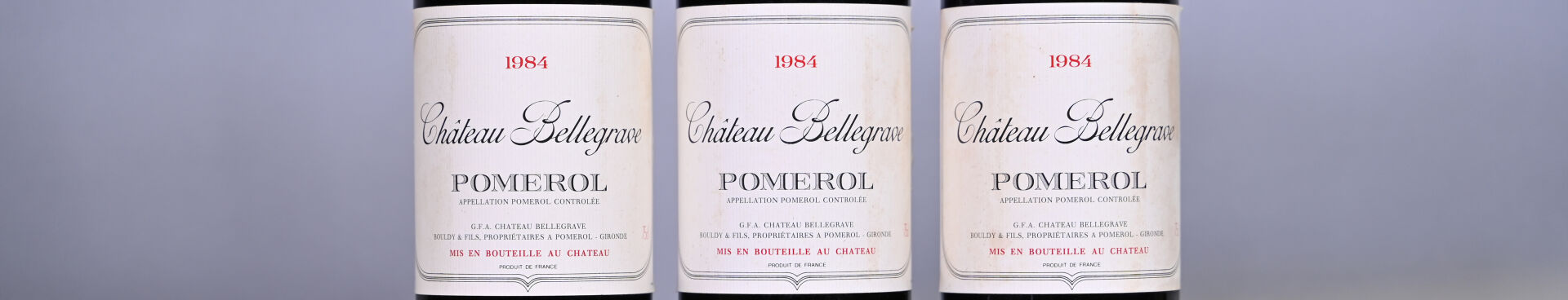 BORDEAUX – 3 bouteilles, Pomerol, Château Bellegrave, 1984. 3 TLB. Etiquettes légèrement sales dont une est abimée au niveau de son côté droit.