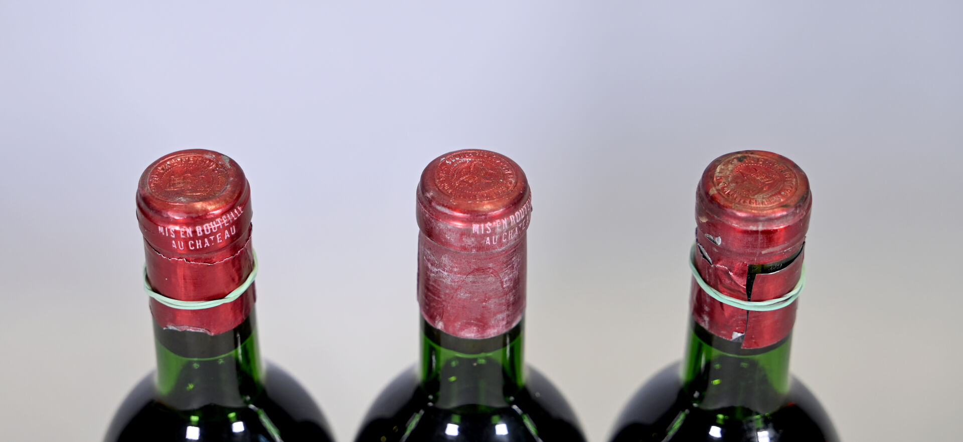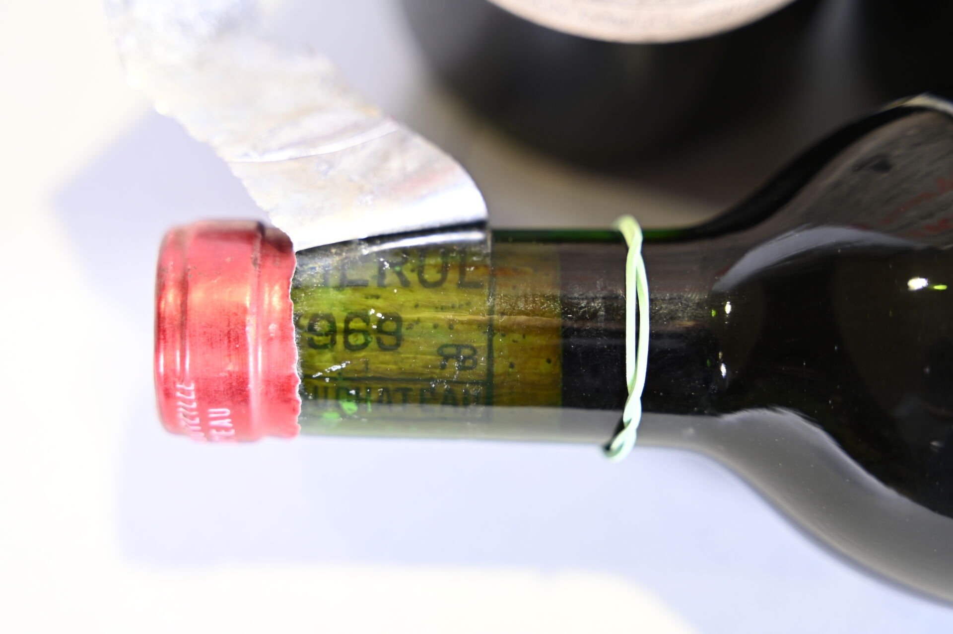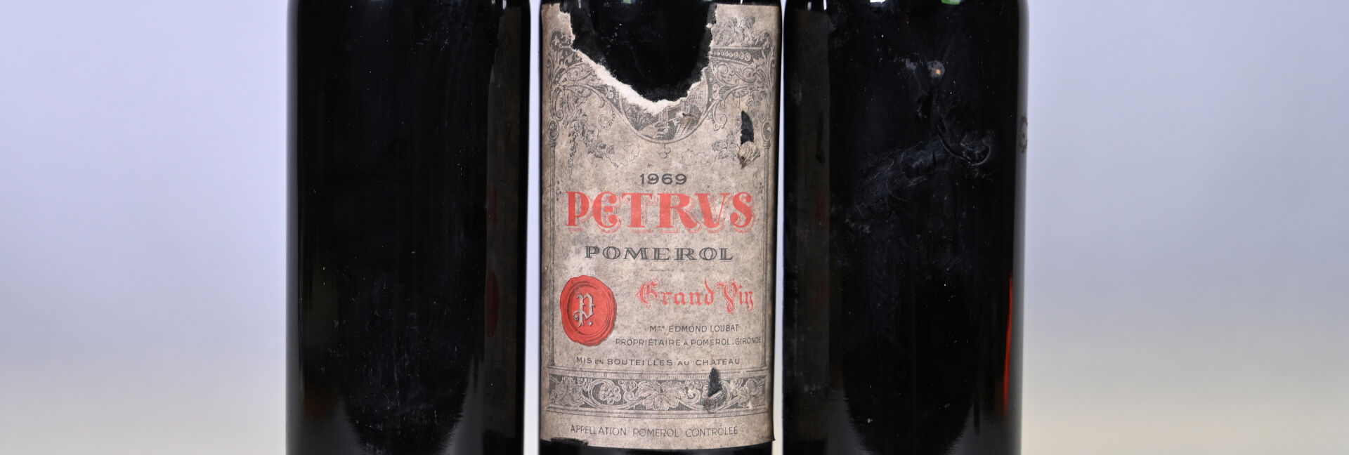 BORDEAUX – 3 bouteilles, Pomerol, Petrus, 1969 (millésime lisible sur le bouchon pour deux bouteilles). Capsules légèrement sales à sales et abimées dont deux ont été incisées pour les besoins de l’expertise. Etiquette très sale avec des déchirures et un manque important dans sa parte supérieure. Deux étiquettes sont manquantes.