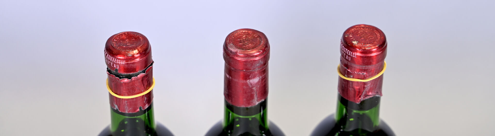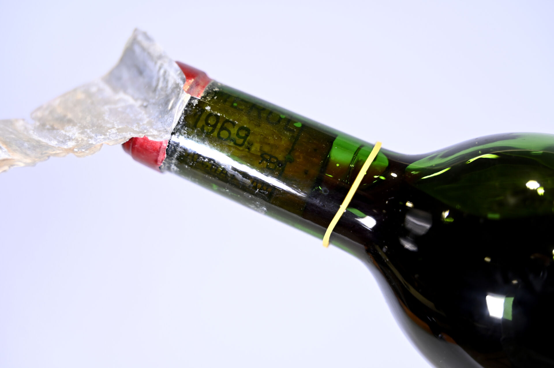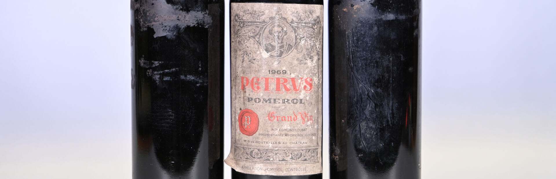 BORDEAUX – 3 bouteilles, Pomerol, Petrus, 1969 (millésime lisible sur les bouchons pour deux bouteilles). 3 TLB (+). Capsules sales, abimées et dont deux ont été incisées pour les besoins de l’expertise. Etiquette sale avec des points de décollement. Deux étiquettes sont manquantes.