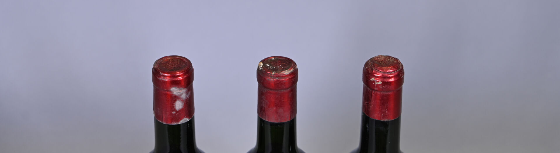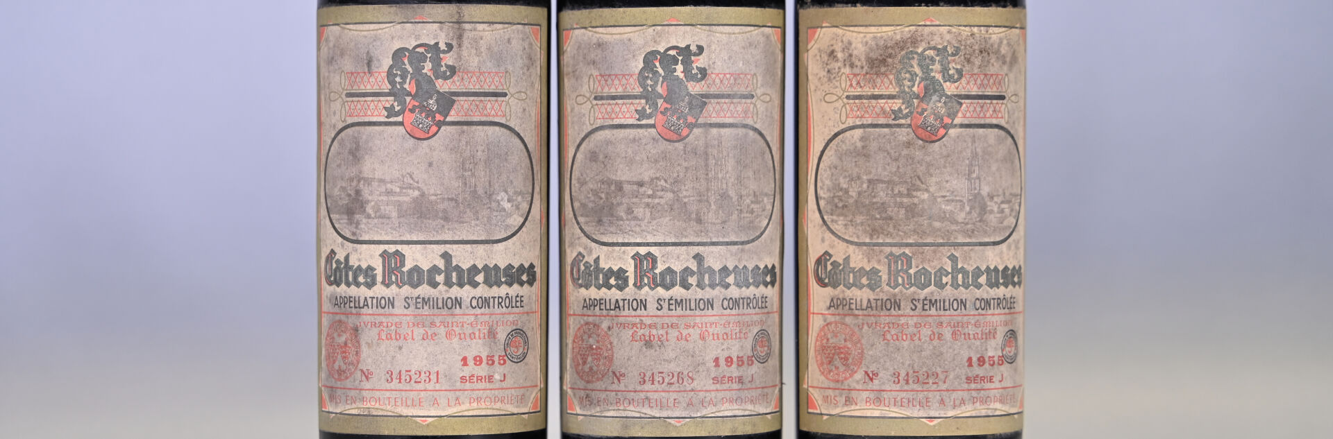 BORDEAUX – 3 bouteilles, Saint-Emilion, Côtes Rocheuses, 1955. 1 TLB, 1 HE et 1 ME (+). Capsules sales, légèrement abimées dont deux sont légèrement incurvées et une déformée. Etiquettes sales.