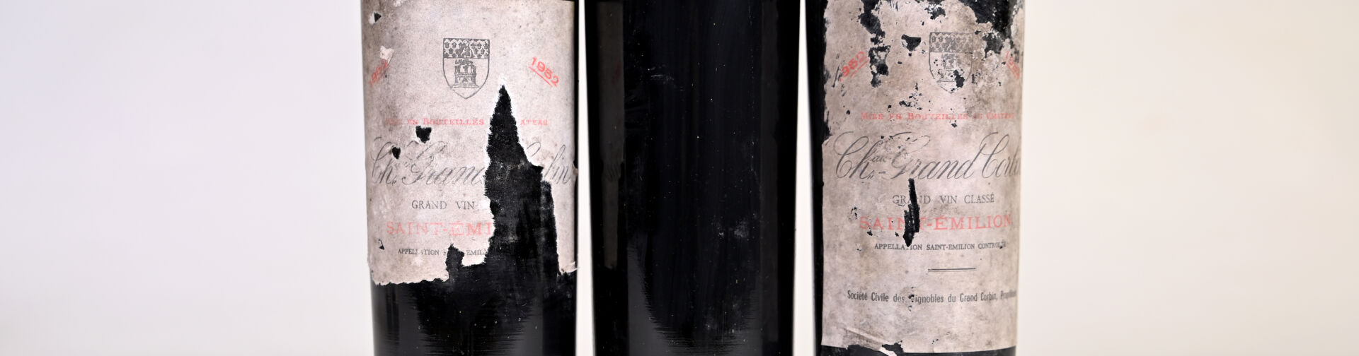 BORDEAUX – 3 bouteilles, Saint-Emilion Grand Cru, Château Grand Corbin, Grand Cru Classé, 1952 (dont une bouteille est présumée de cette référence). Bouchons engagés. 3 ME. Capsules sales et déformées en leur sommet. Etiquettes sales et dégradées à très dégradées. Une étiquette est manquante.