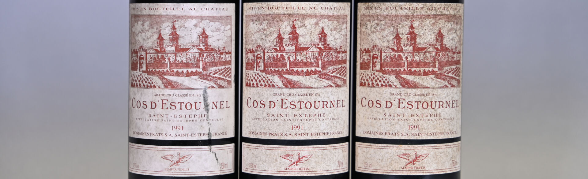 BORDEAUX – 3 bouteilles, Saint-Estèphe, Château Cos d’Estournel, 2ème Grand Cru Classé, 1991. Capsules très légèrement sales. Etiquettes légèrement sales à sales dont une est abimée.