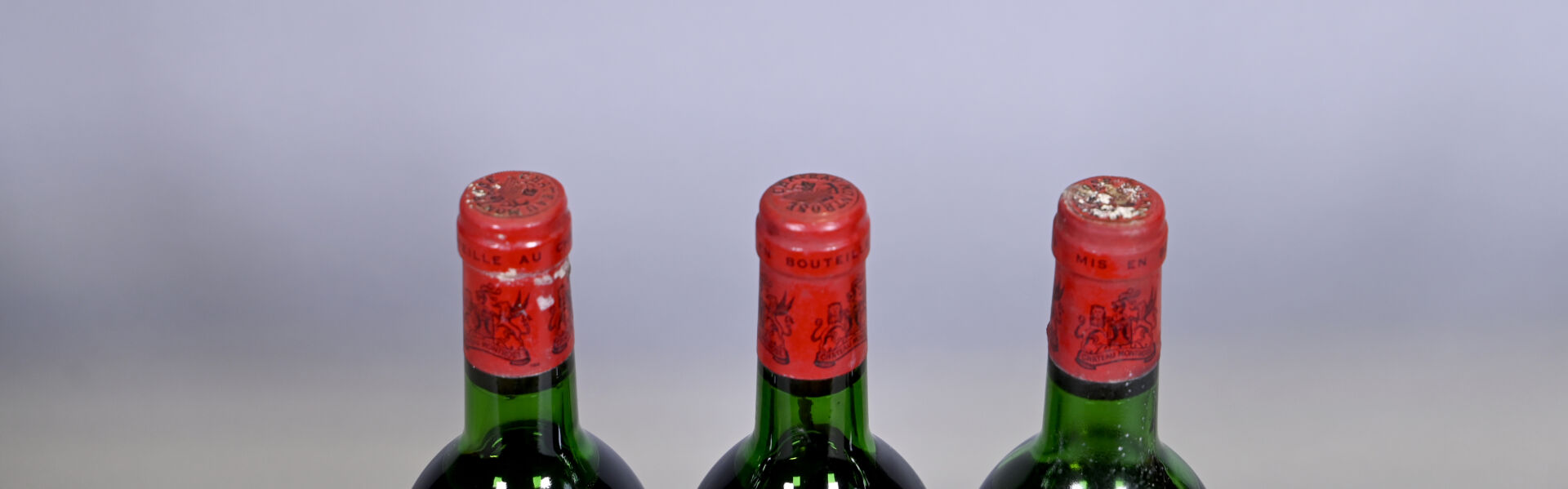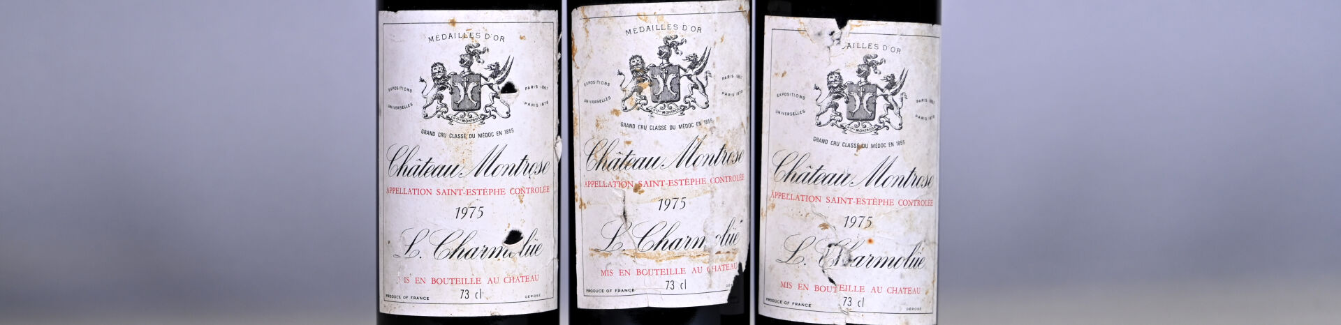 BORDEAUX – 3 bouteilles, Saint-Estèphe, Château Montrose, 2ème Grand Cru Classé, 1975. 2 ME (+) et 1 ME. Capsules légèrement sales à sales dont une est abimée en bas de jupe. Etiquettes sales et abimées.