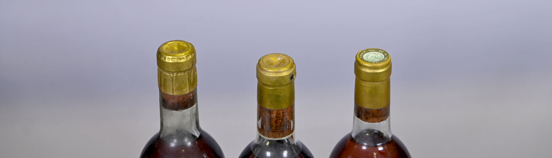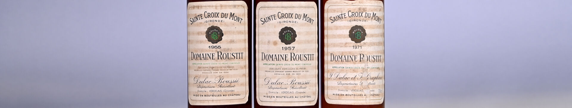 BORDEAUX – 3 bouteilles, Sainte-Croix-du-Mont, Domaine Roustit, 1955 (1), 1957 (1) et 1971 (1). Deux bouchons légèrement engagés (1955 et 1971) et un bouchon très engagé (1957). 2 TLB (+). Capsules légèrement incurvées à incurvées, légèrement sales et dont une présente une petite déchirure au niveau de sa bague. Etiquettes légèrement sales à sales dont une est également légèrement abimée.