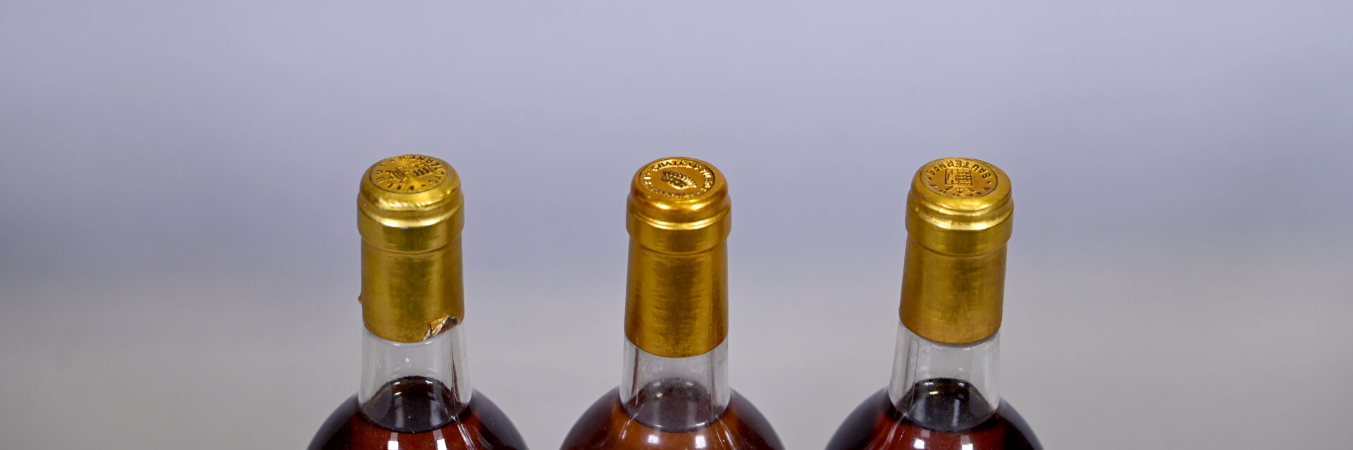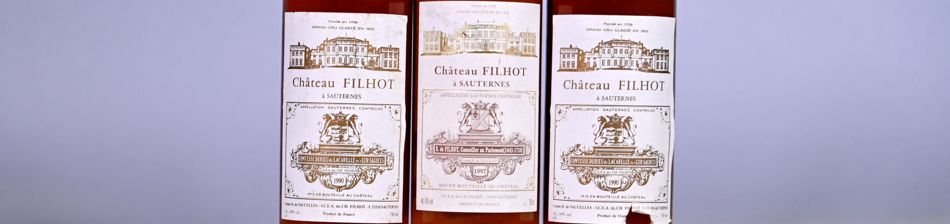 BORDEAUX – 3 bouteilles, Sauternes, Château Filhot, 2ème Grand Cru Classé, 1990 (2) et 1997 (1). 3 BG (-). Capsules légèrement sales dont une est légèrement incurvée et une autre est abimée en bas de jupe. Etiquettes légèrement sales dont une présente une déchirure et une autre deux légers accrocs.