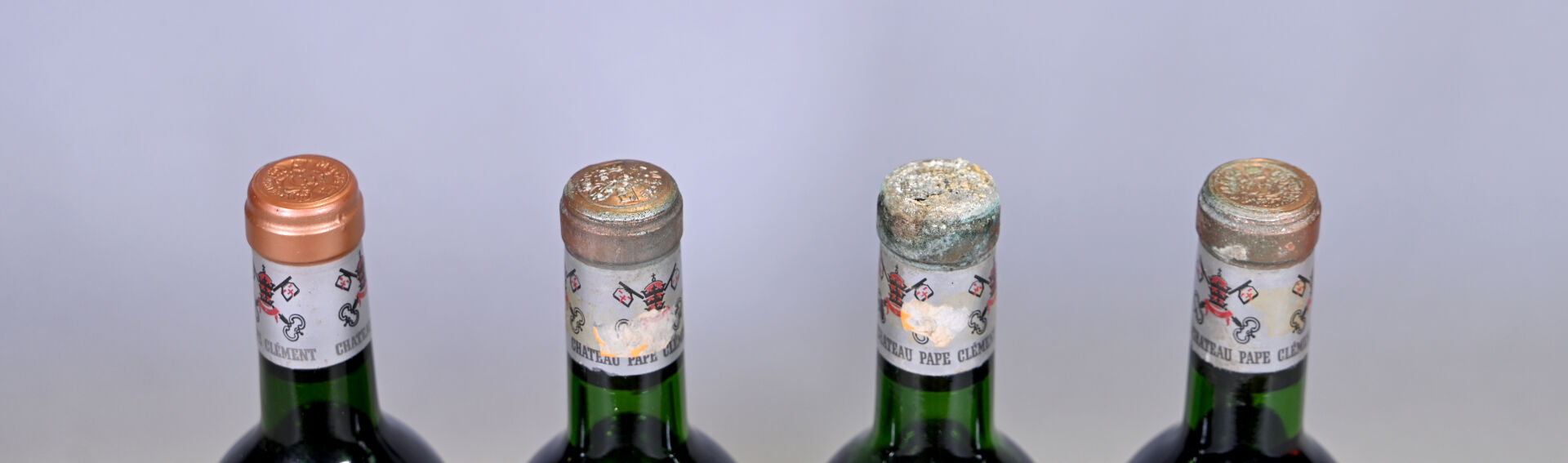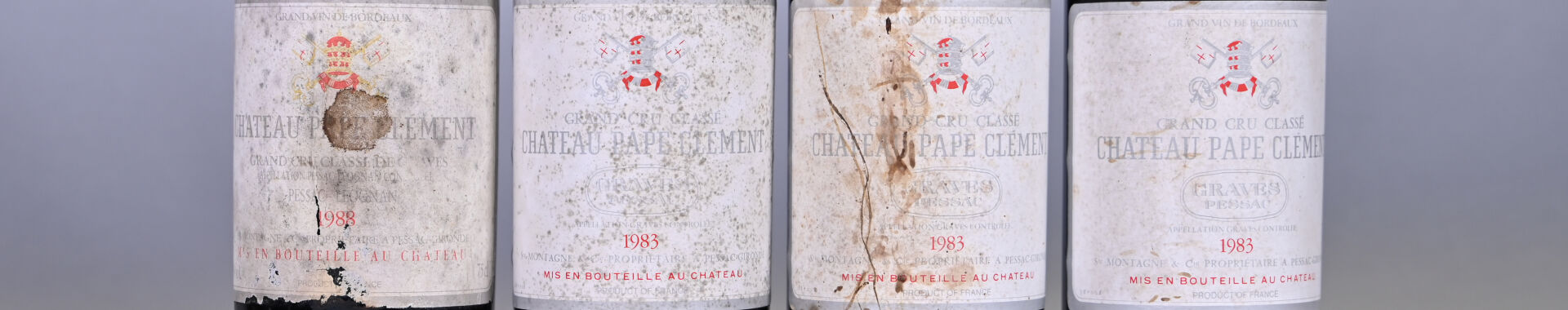 BORDEAUX – 4 bouteilles, Graves / Pessac- Léognan, Château Pape Clément, Grand Cru Classé, 1983 (3) et 1988 (1). Traces de coulure ancienne sur une bouteille. 2 BG (-) et 1 HE (-). Capsules légèrement sales à très sales dont une est abimée en son sommet. Etiquettes légèrement sales à sales, tachées avec des traces d’humidité et dont deux sont abimées.