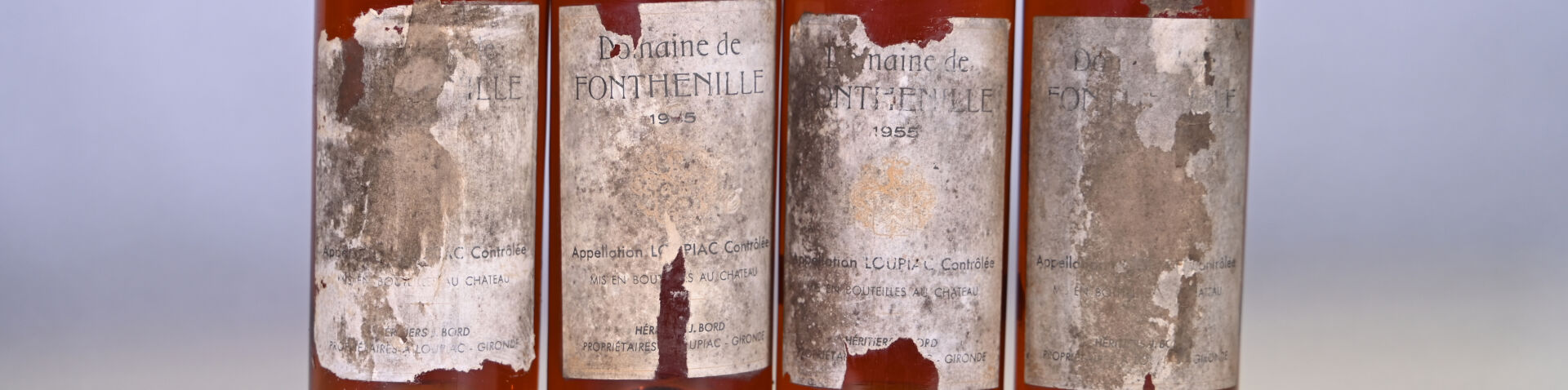 BORDEAUX – 4 bouteilles, Loupiac, Domaine de Fonthenille, 1955 (dont trois bouteilles sont probablement également de ce millésime). 2 BG (-), 1 TLB (+) et 1 TLB (-). Capsules sales, tachées et déformées en leur sommet. Etiquettes sales à très sales et dégradées à très dégradées.