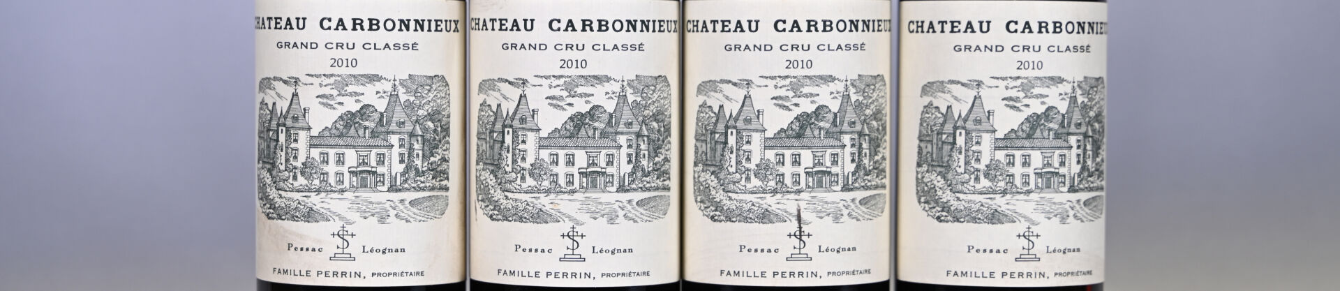 BORDEAUX – 4 bouteilles, Pessac-Léognan, Château Carbonnieux, Grand Cru Classé, 2010. Une étiquette avec une trace et une autre très légèrement sale.
