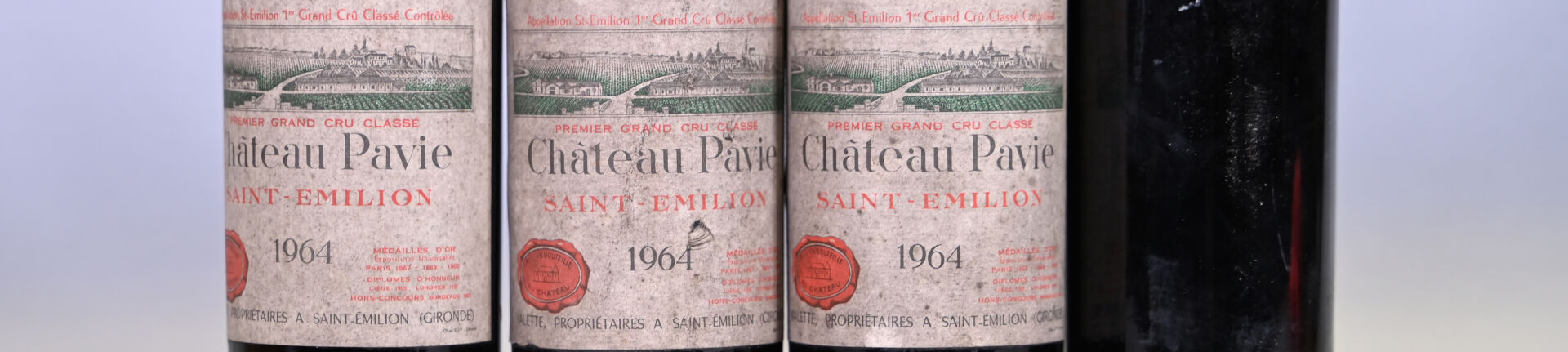 BORDEAUX – 4 bouteilles, Saint-Emilion Grand Cru, Château Pavie, 1er Grand Cru Classé A, 1964 (une bouteille dont le millésime est lisible sur le bouchon). 1 TLB (-), 1 HE et 2 ME (+). Capsules sales à très sales, légèrement incurvées et dont une a été incisée pour les besoins de l’expertise. Etiquettes sales dont une présente une petite déchirure. Une étiquette est manquante.