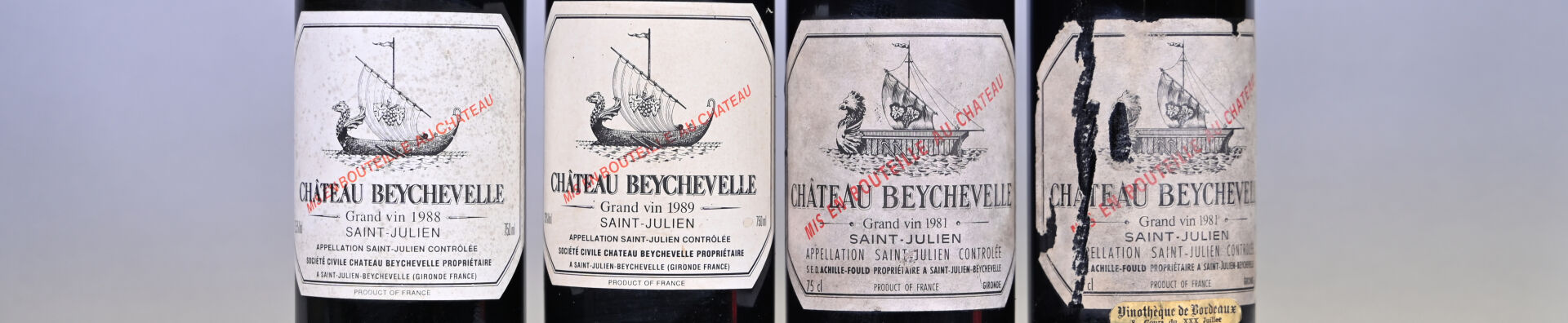 BORDEAUX – 4 bouteilles, Saint-Julien, Château Beychevelle, 4ème Grand Cru Classé, 1981 (2), 1988 (1) et 1989 (1). 1 BG, 1 BG (-) et 2 TLB (+). Capsules légèrement sales dont deux sont légèrement incurvées et une abimée. Etiquettes légèrement sales dont une est dégradée.