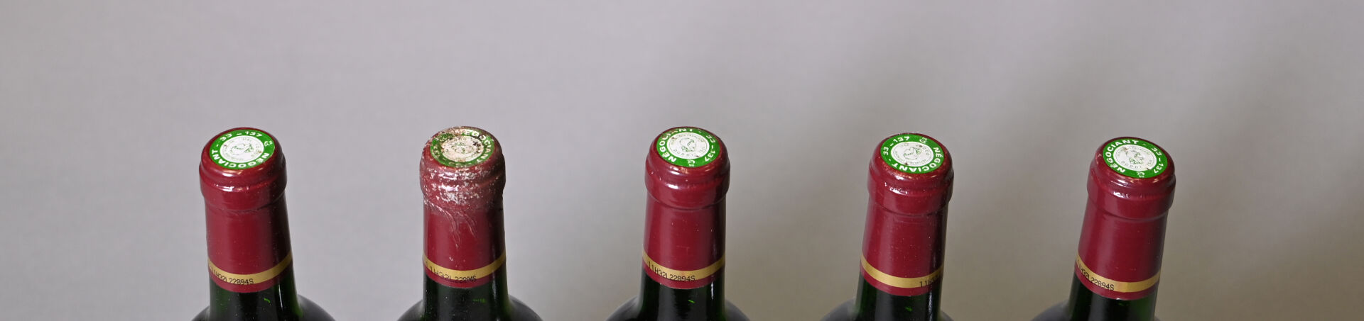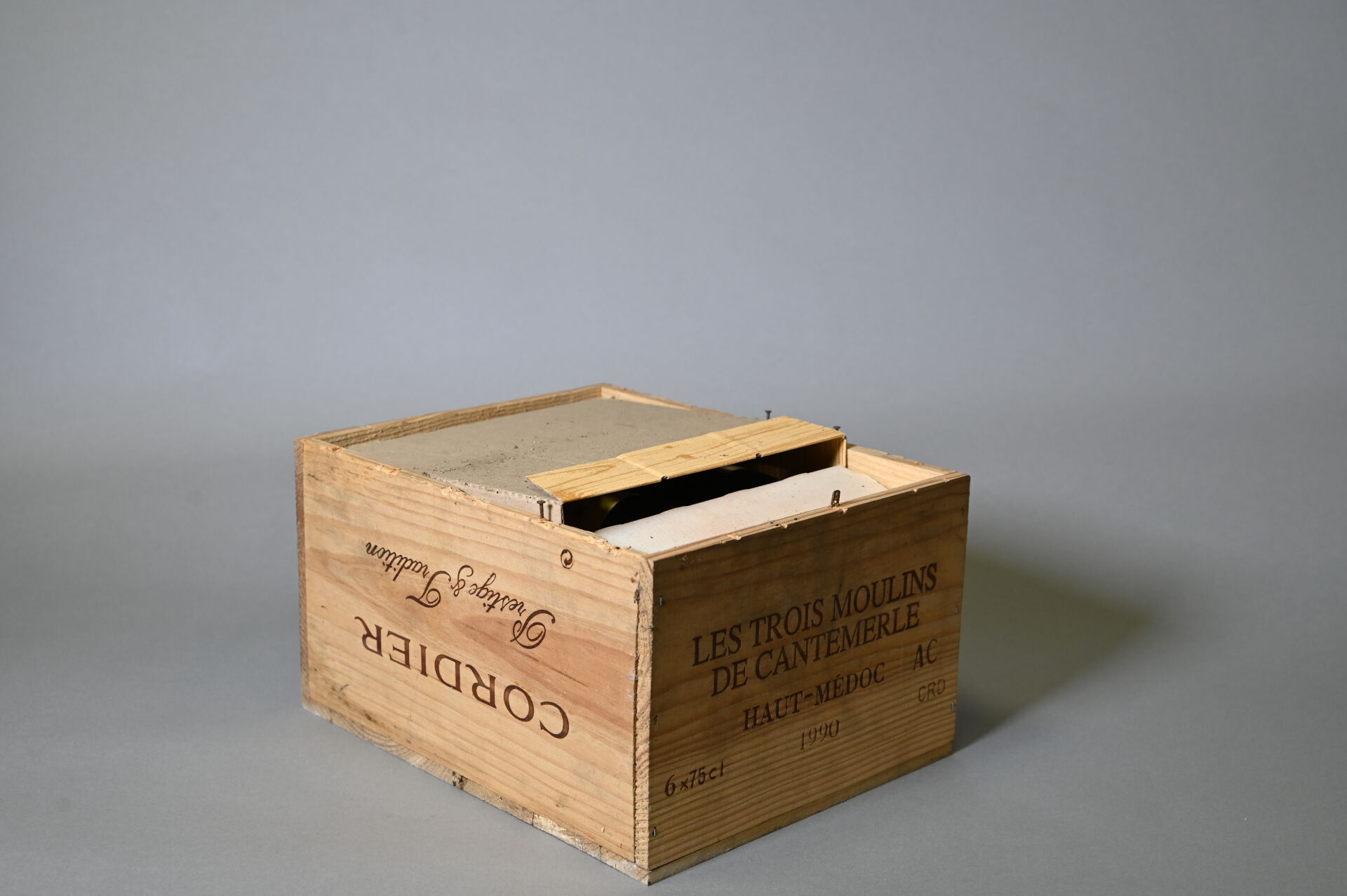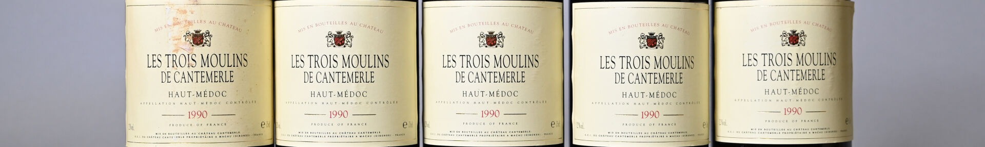 BORDEAUX – 5 bouteilles, Haut-Médoc, Les Trois Moulins de Cantemerle, 1990. En caisse bois. 1 BG (-), 1 HE (+) et 3 HE. Une capsule sale. Etiquettes avec des points de décollement dont une est également sale. Quatre contre-étiquettes avec des petits points de décollement et une est sale, dégradée et partiellement décollée.