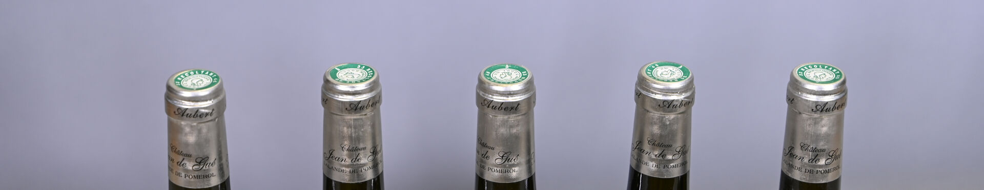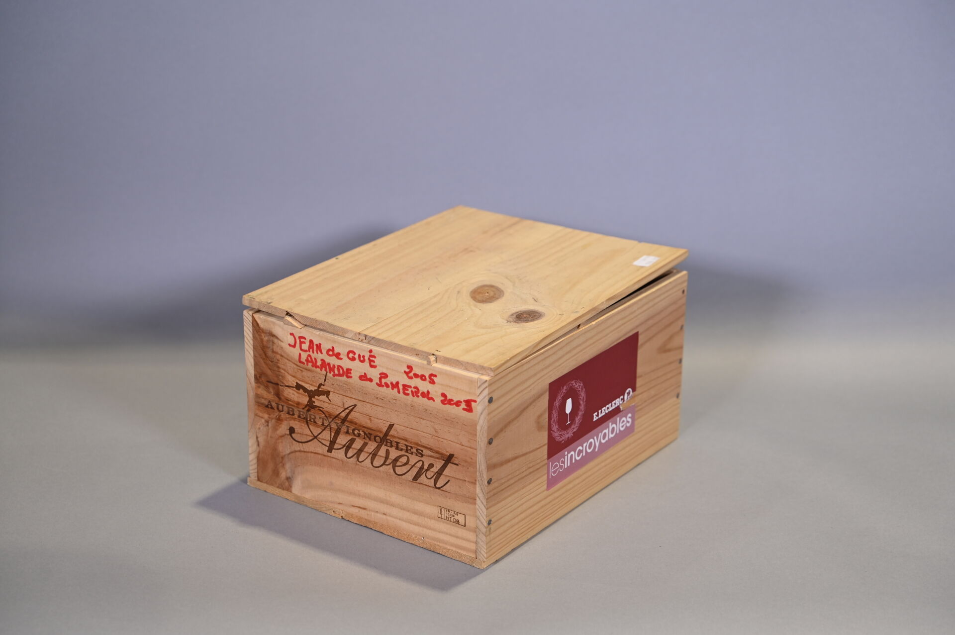 BORDEAUX – 5 bouteilles, Lalande-de-Pomerol, Château Jean de Gué, 2005. En caisse bois. 3 BG et 2 BG (-).