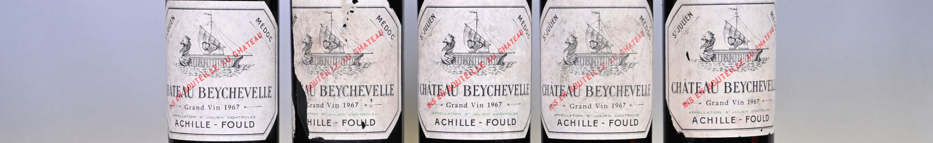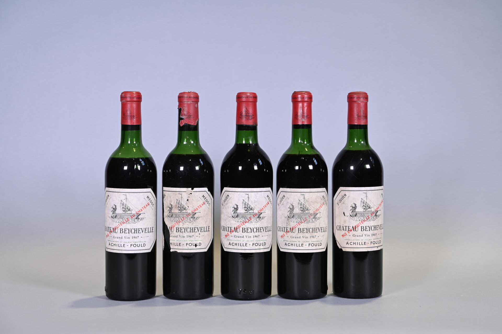 BORDEAUX – 5 bouteilles, Saint-Julien, Château Beychevelle, 4ème Grand Cru Classé, 1967. 1 BG, 1 ME (+), 2 ME et 1 ME (-). Capsules sales, déformées en leur sommet et dont une est très abimée. Etiquettes légèrement sales dont deux sont légèrement abimées à abimées.