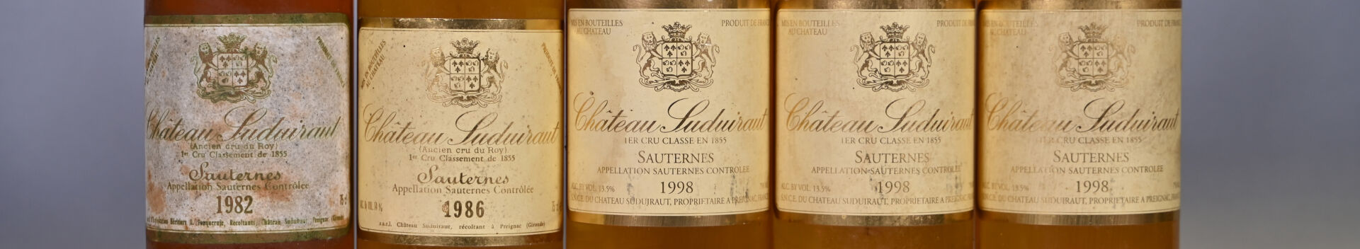 BORDEAUX – 5 bouteilles, Sauternes, Château Suduiraut, 1er Grand Cru Classé, 1982 (1), 1986 (1), 1998 (3) . 3 BG (+), 1 BG et 1 TLB (+). Capsules légèrement sales à sales dont deux sont bombées et une est déformée. Etiquettes légèrement sales à sales.