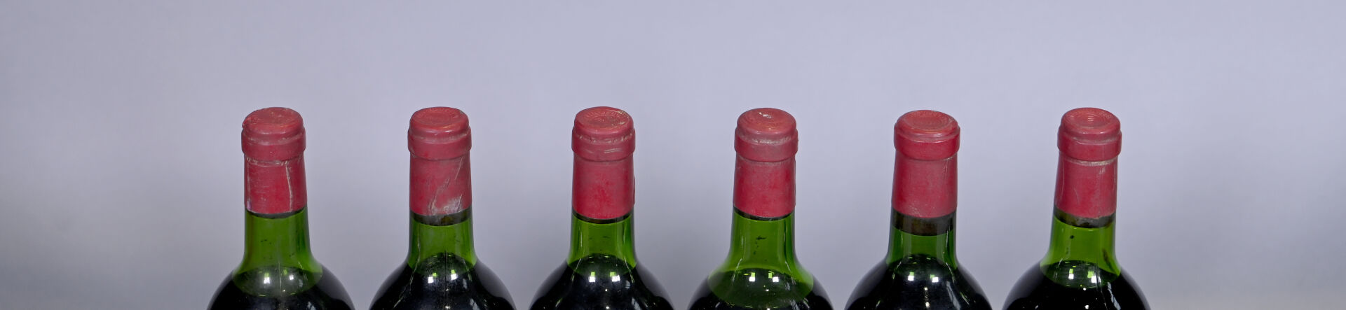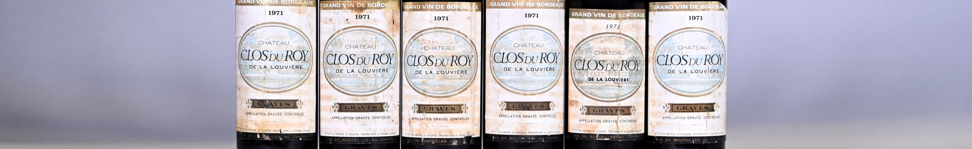 BORDEAUX – 6 bouteilles, Graves, Château Clos du Roy de la Louvière, 1971. 3 BG (-), 1 TLB, 1 HE (+) et 1 ME (+). Capsules légèrement sales dont quatre sont incurvées. Etiquettes sales et légèrement abimées.
