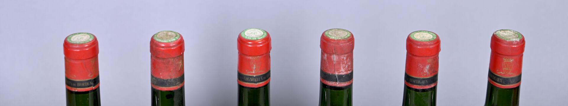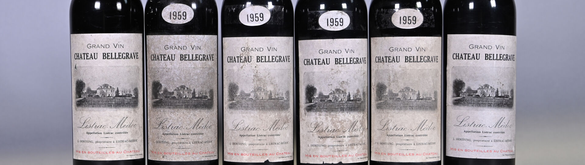 BORDEAUX – 6 bouteilles, Listrac, Château Bellegrave, 1959 (dont deux bouteilles sont supposées de ce millésime). 1 HE, 3 HE (-) et 2 ME (+). Capsules sales et déformées en leur sommet. Pastilles légèrement sales dont trois sont entièrement décollées. Etiquettes légèrement sales à sales dont trois sont légèrement abimées.